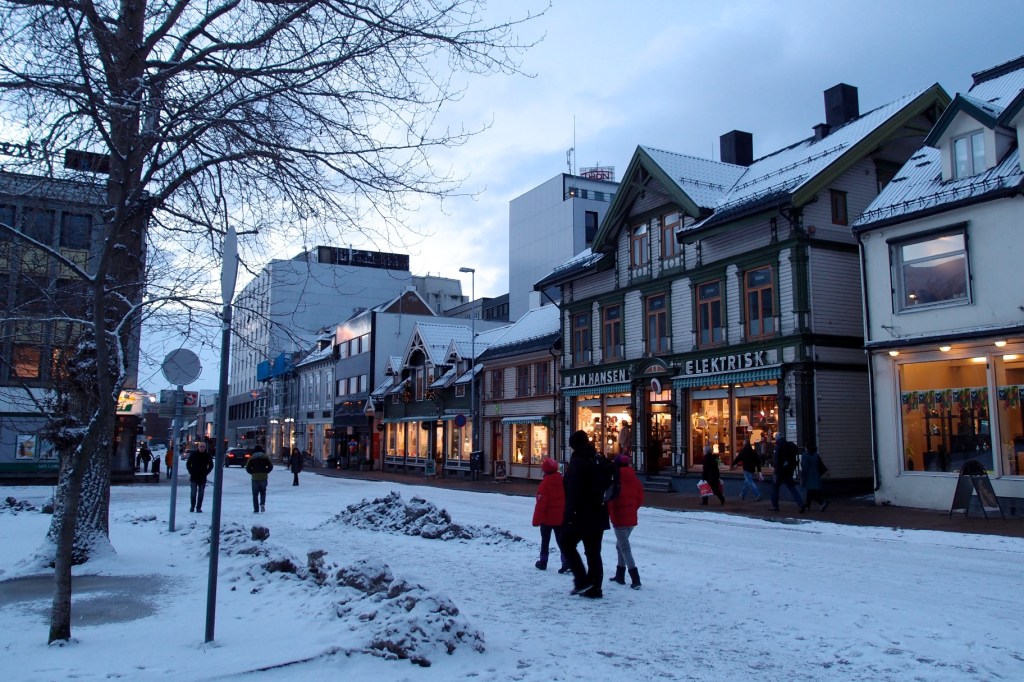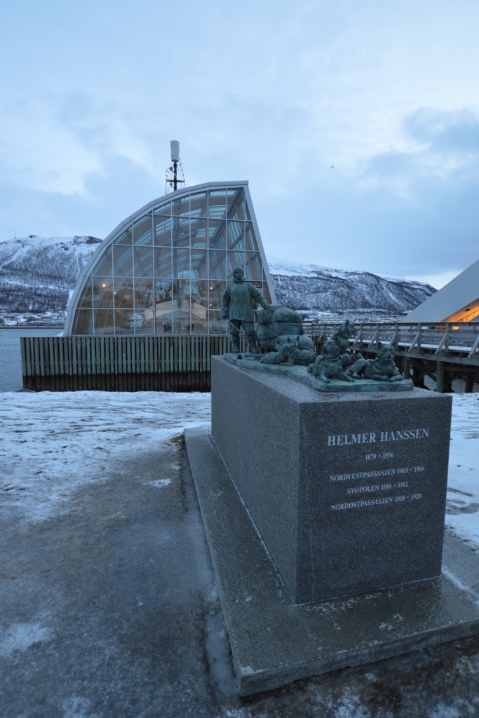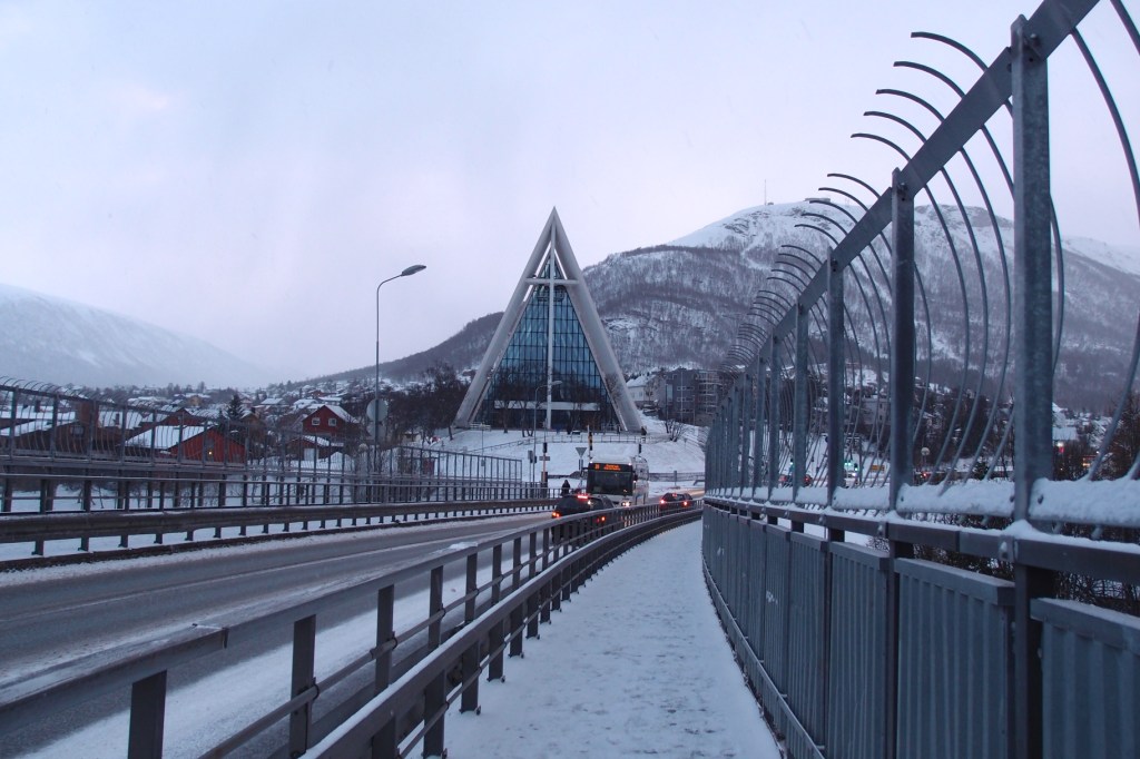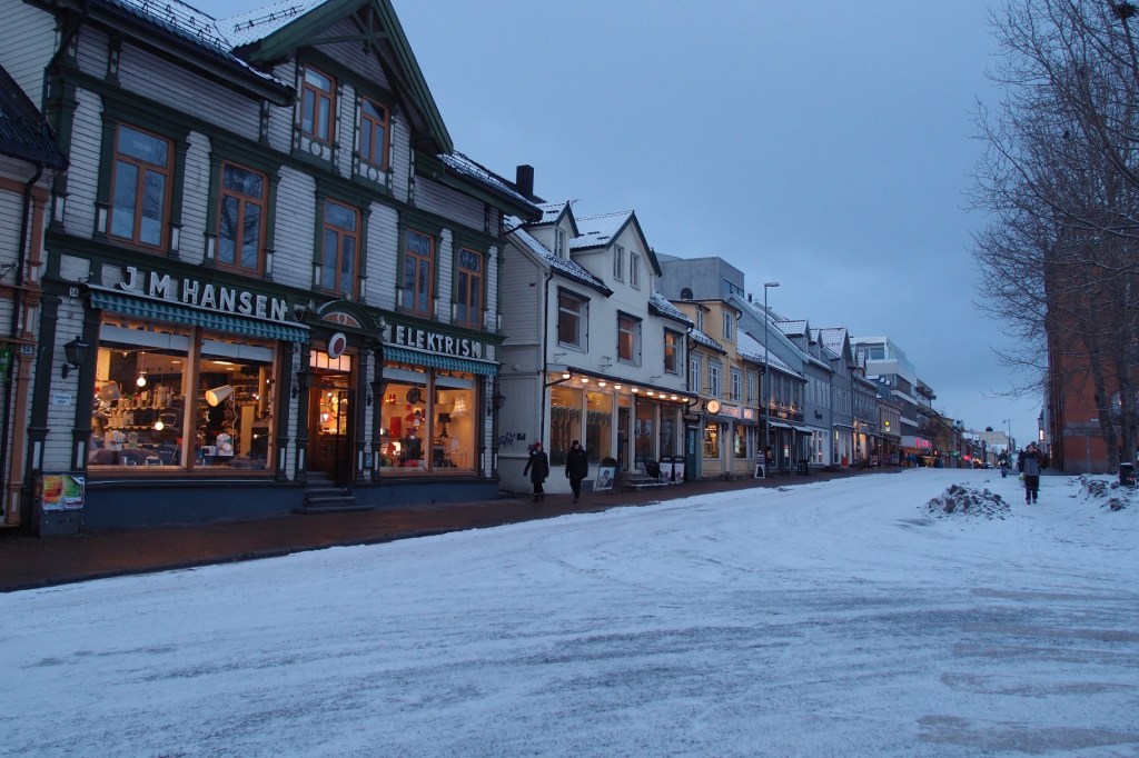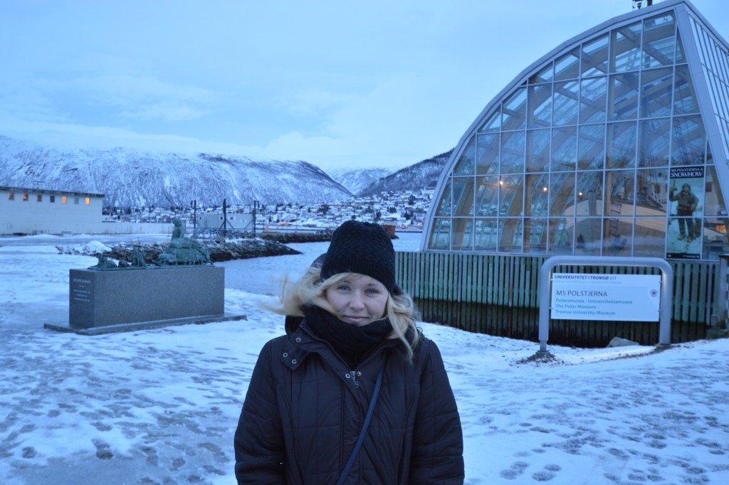 Poranek okazał się nocą. Nie było słońca, wstało dopiero o 10:45. Zjedliśmy śniadanie w hotelowej restauracji. Na dzisiaj zaplanowaliśmy sobie zwiedzanie miasta i odwiedzenie muzeum. Samo miasto położone jest bardzo malowniczo na wyspie. Z lądem łączą je smukłe strzeliste mosty, bardzo długie i wąskie. Przejazd po nich w czasie gdy wieje mocny wiatr a ulica pokryta jest prawie całkowicie lodem budził lekki dreszczyk emocji. Budynki w Tromso to typowe skandynawskie budownictwo : prosta forma, dużo drewna i skał. Wszystkie domki wyglądają bardzo podobnie. Są skromne, mają duże okna, w których Norwegowie wieczorną porą zaświecają świece lub nocne lampki. Tuż po zmroku całe miasto i okoliczne miejscowości są przez to pięknie rozświetlone a mróz wydaje się pzez to mniej siarczysty. Godnym polecenia miejscem w centrum Tromso, zarówno dla dorosłych jak i dla dzieci jest Polaria – muzeum arktycznej flory i fauny z dużym basenem dla fok.
