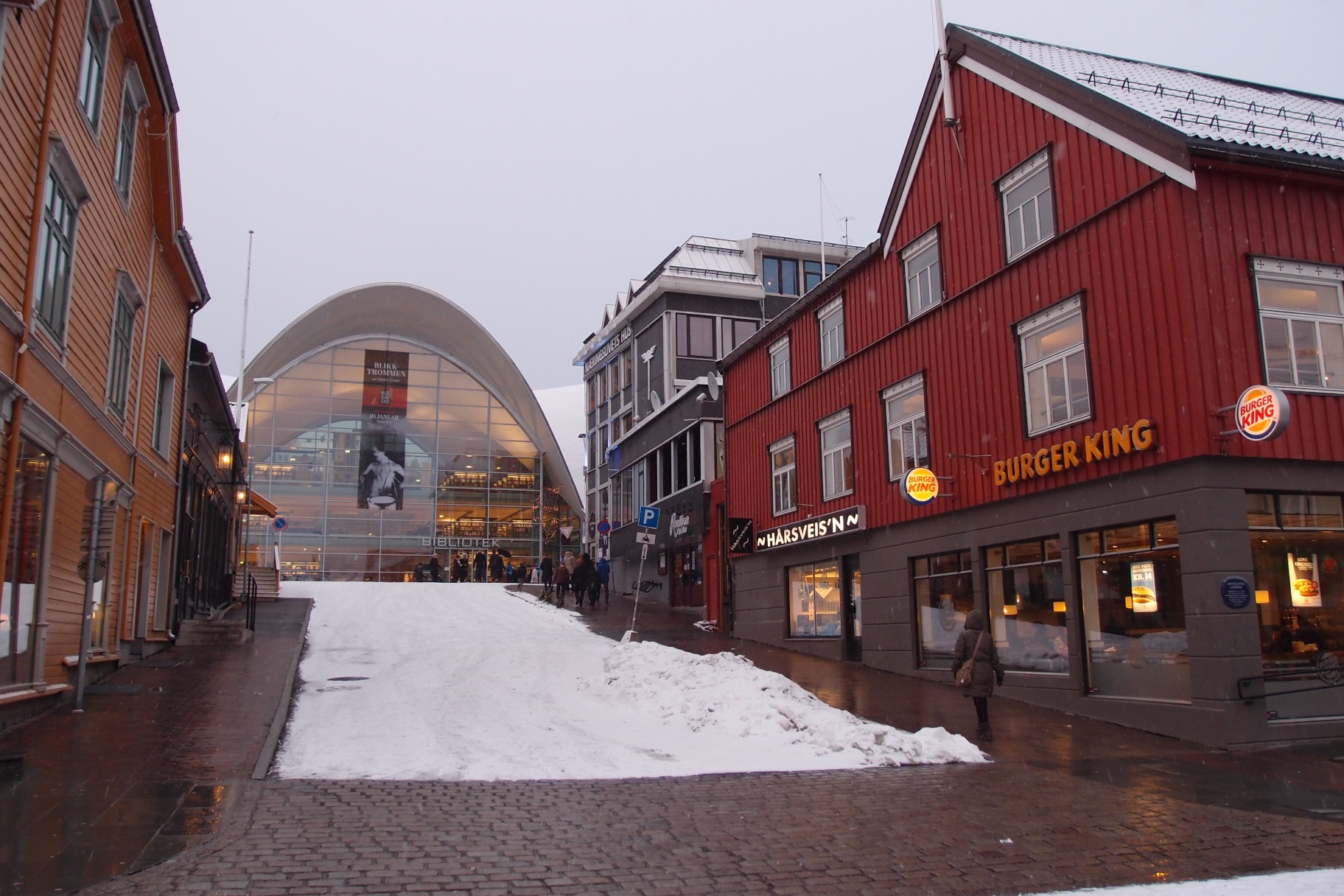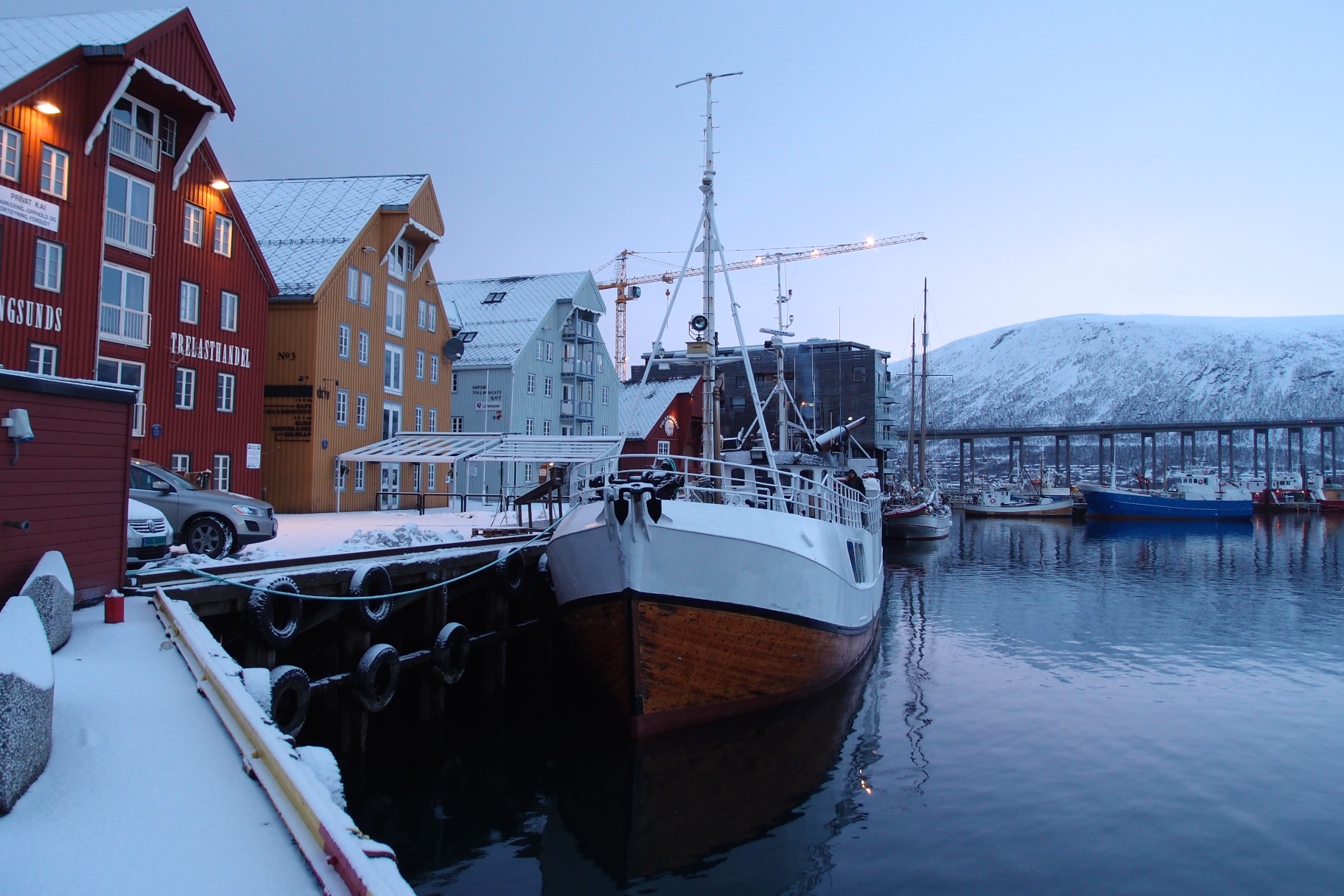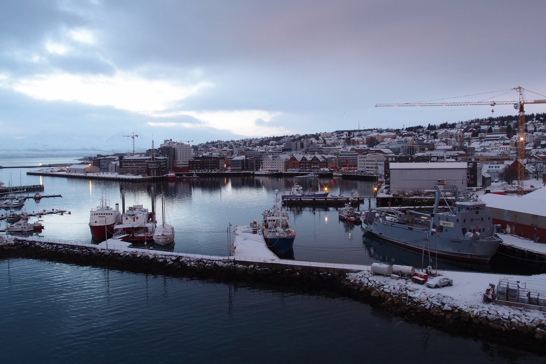 Poranek okazał się nocą. Nie było słońca, wstało dopiero o 10:45. Zjedliśmy śniadanie w hotelowej restauracji. Na dzisiaj zaplanowaliśmy sobie zwiedzanie miasta i odwiedzenie muzeum. Samo miasto położone jest bardzo malowniczo na wyspie. Z lądem łączą je smukłe strzeliste mosty, bardzo długie i wąskie. Przejazd po nich w czasie gdy wieje mocny wiatr a ulica pokryta jest prawie całkowicie lodem budził lekki dreszczyk emocji. Budynki w Tromso to typowe skandynawskie budownictwo : prosta forma, dużo drewna i skał. Wszystkie domki wyglądają bardzo podobnie. Są skromne, mają duże okna, w których Norwegowie wieczorną porą zaświecają świece lub nocne lampki. Tuż po zmroku całe miasto i okoliczne miejscowości są przez to pięknie rozświetlone a mróz wydaje się pzez to mniej siarczysty. Godnym polecenia miejscem w centrum Tromso, zarówno dla dorosłych jak i dla dzieci jest Polaria – muzeum arktycznej flory i fauny z dużym basenem dla fok.