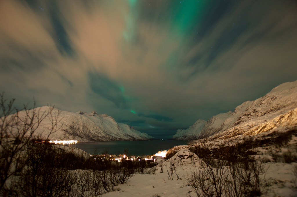 Pojechaliśmy na najbardziej obfotografowany przez profesjonalistów i amatorów klif – Ersfjorden, położony zaledwie 20 kilometrów od Tromso. Znaleźliśmy dogodne dla obiektywu miejsce i rozpoczęliśmy łowy. Czekaliśmy kilka godzin. Zorza pokazała się niespodziewanie bezpośrednio nad nami.
