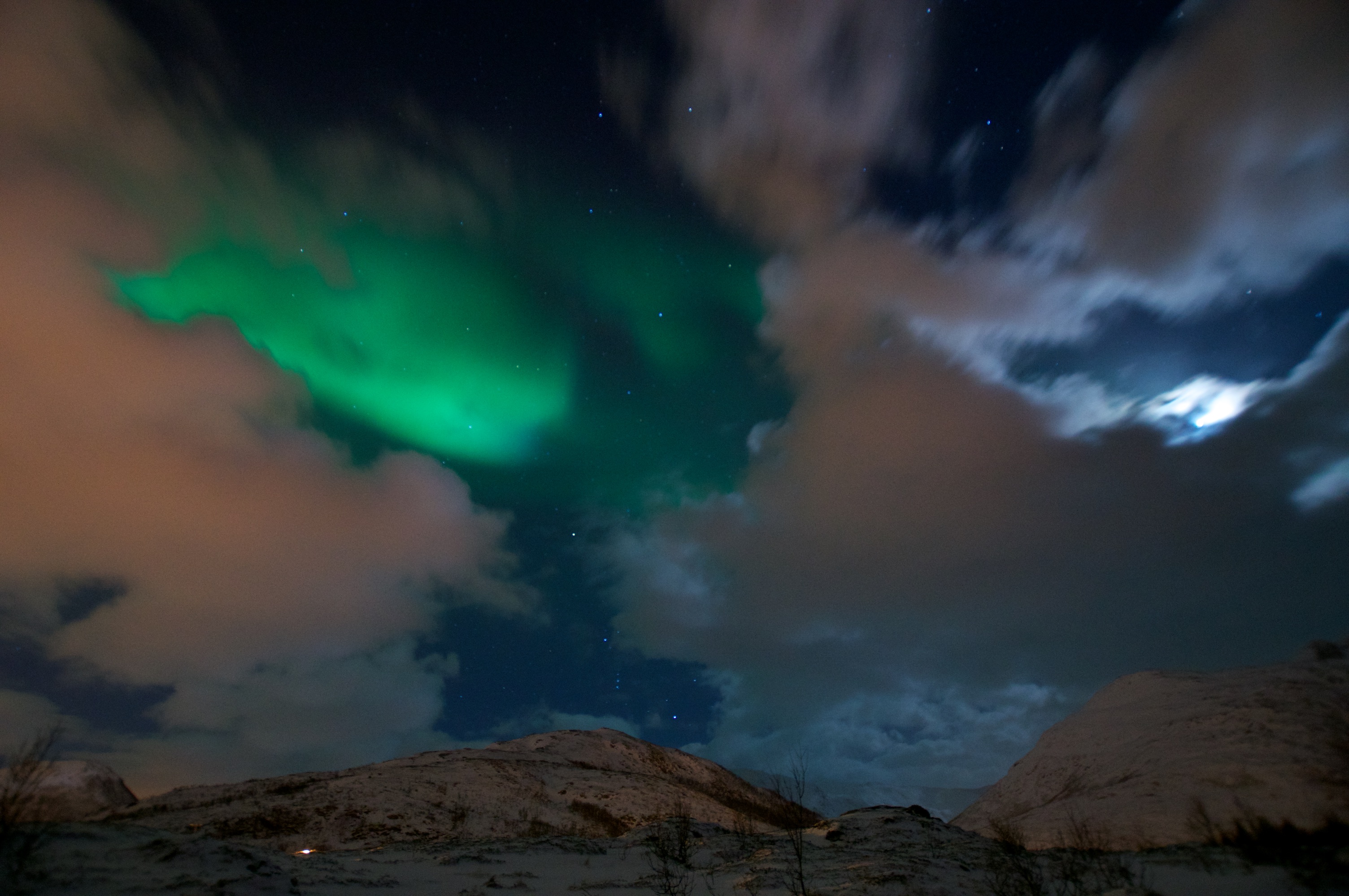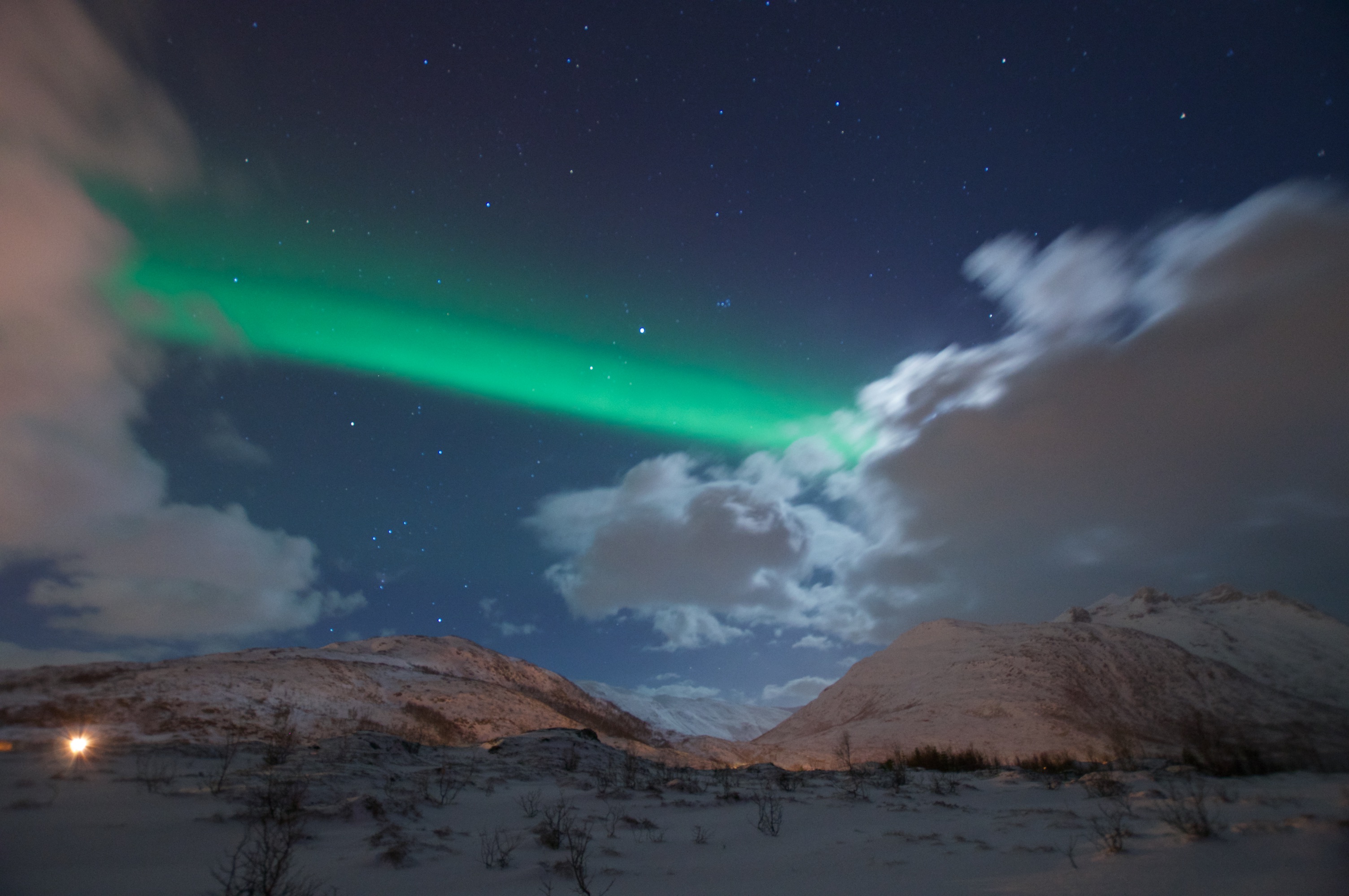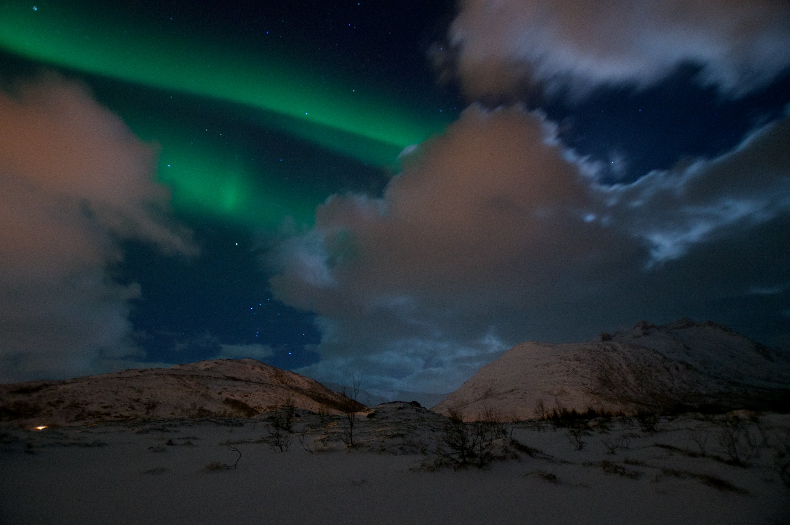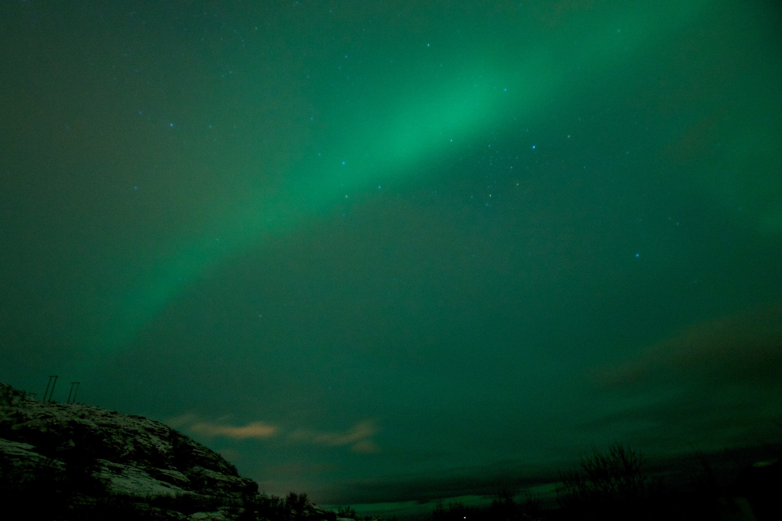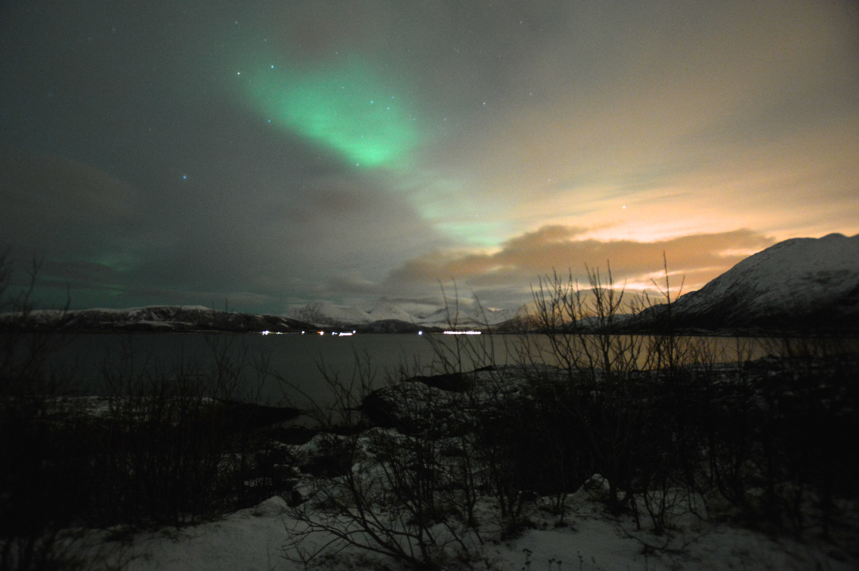 Pojechaliśmy dalej Udaliśmy się w kierunku Sommaroy oddalonego od Tromso o 36 kilometrów. Kolejną Zorzę, o wiele mniejszą od poprzedniczki zauważyliśmy z okna samochodu. Zatrzymując się przy zatoce, gdzieś przy drodze na zachód od Sjotun, zrobiliśmy kilkanaście zdjęć i wróciliśmy do hotelu.