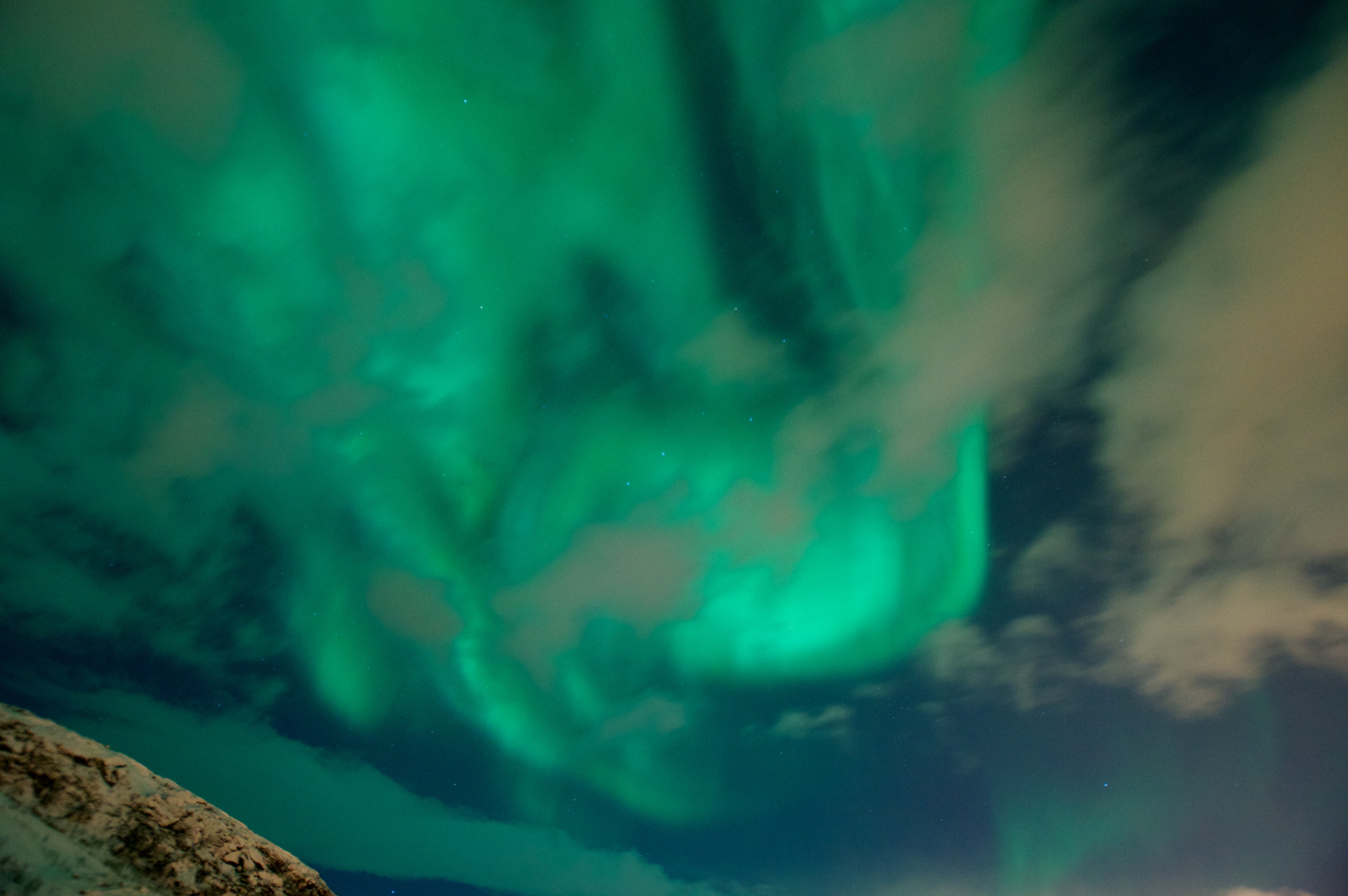 Zrobiliśmy całą serię zdjęć i pomyśleliśmy, że to już koniec. Powiedzieliśmy sobie, że to ostatnie zdjęcie i wracamy do hotelu i dokładnie w tym momencie pojawiła się ponownie. Tym razem błysnęła zdaje się całą mocą. Okrążała nas. Całe niebo pokryło się jej zielenią. Niesamowity widok. Nie można było skupić wzroku na jednym miejscu bo gdy pojawiała się w innej części nieba szybko kradła uwagę. Czasem pojawiała się w kształcie tęczy, czasem dymiła zza góry. Opisy Zorzy mogę mnożyć w nieskończoność.