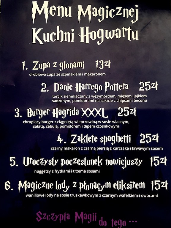 Menu w restauracji również było poterrowe 🙂 Czarny burger i Danie Harry-ego smakowały wyśmienicie 🙂