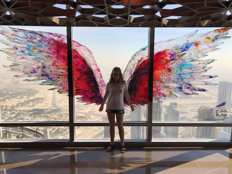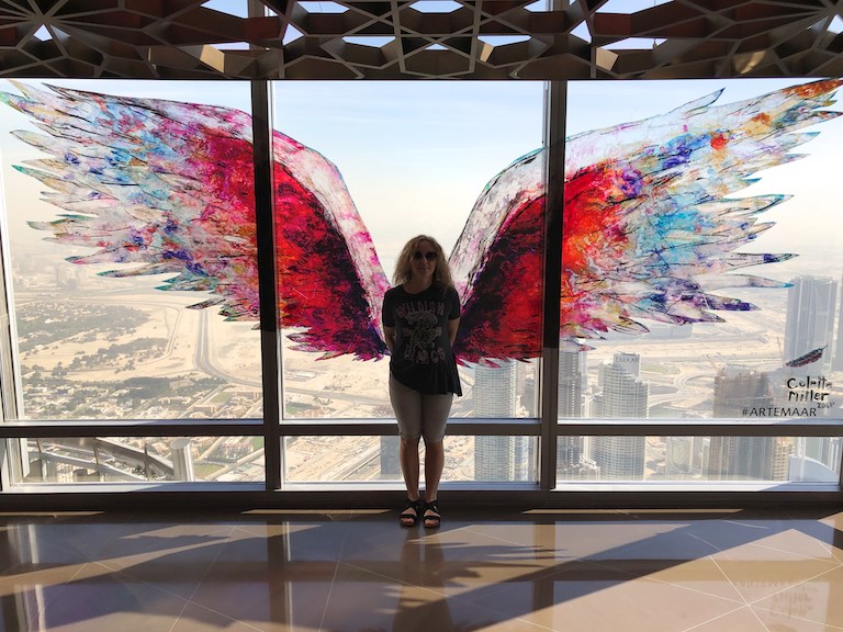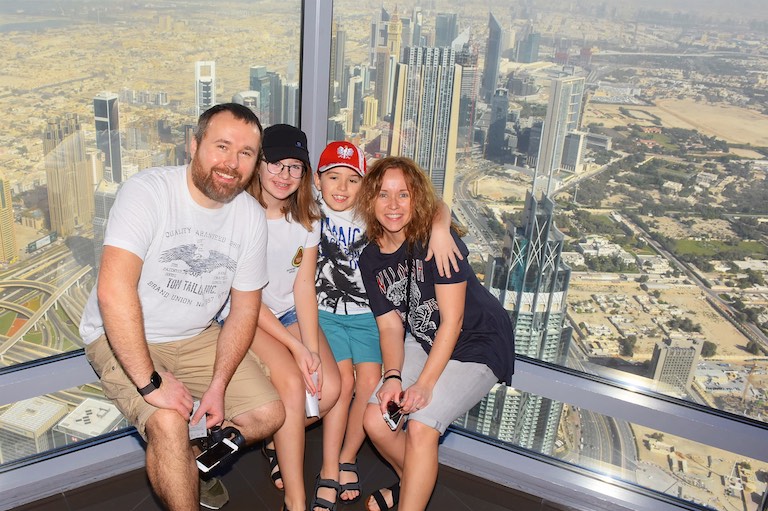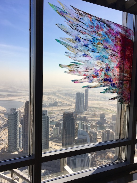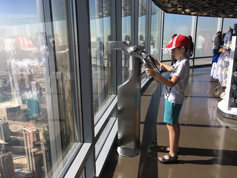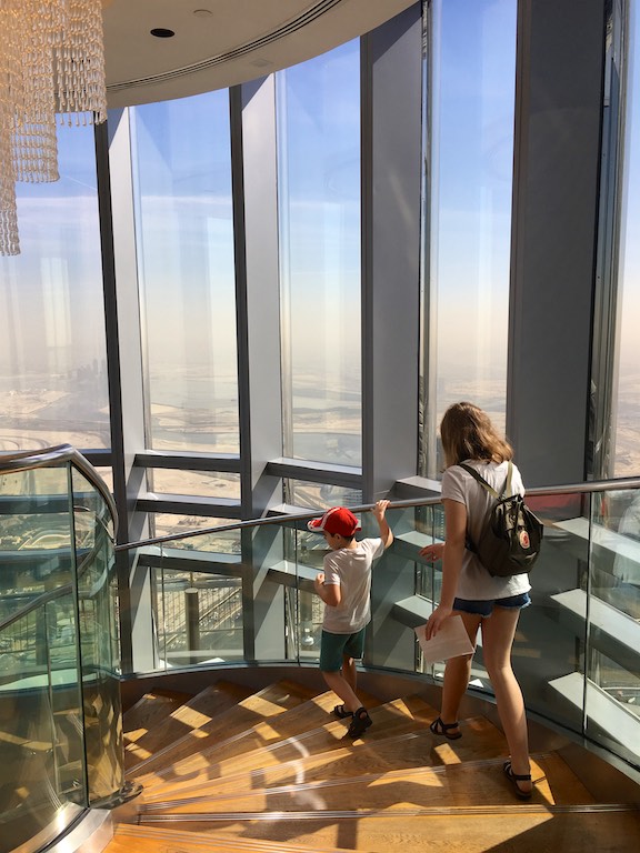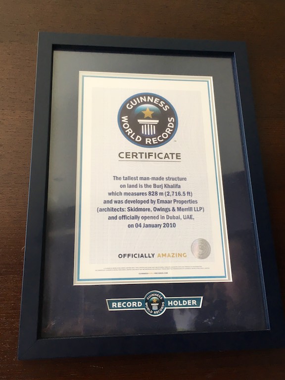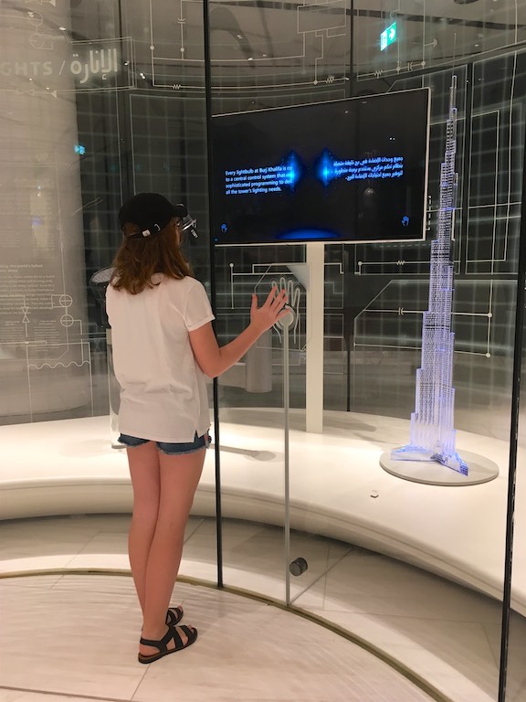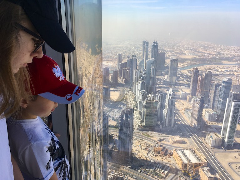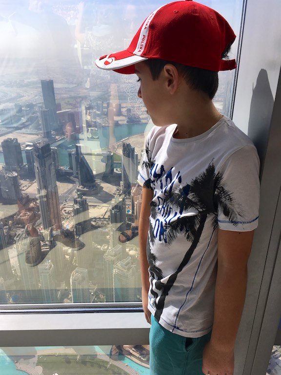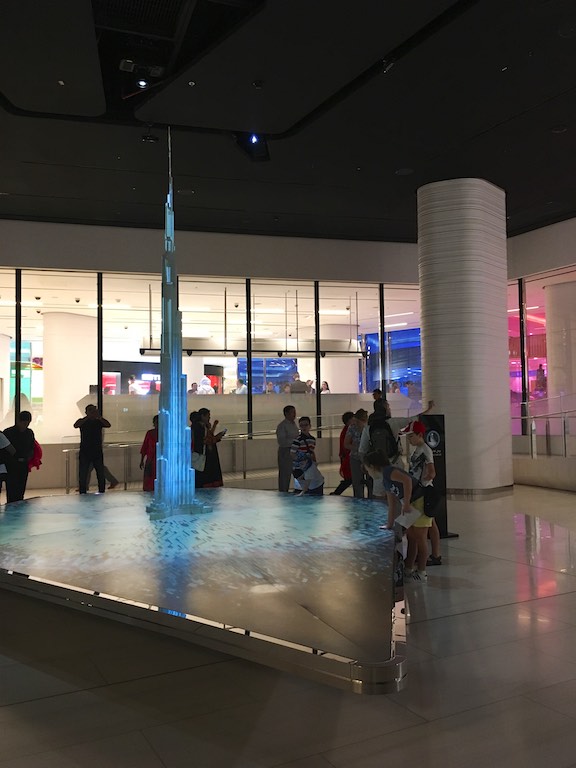 Dotarliśmy do Burj Kalifa, najwyższego budynku na świecie, wpisanego do Księgi Guinnessa. Burj Kalifa mieści się w dubajskim Mallu. Nasz bilet uprawniał nas do wjazdu na 124 i 125 piętro. Można dostać się tam dwiema windami, do której stoi niewielka ( a przynajmniej my na taką trafiliśmy) kolejka. W windzie na ścianach i suficie pokazywana jest prezentacja informująca, na którym jesteśmy piętrze i porównująca wysokość do znanych na świecie innych budynków. Bardzo uprzyjemnia to drogę na szczyt. Burj Kalifa ma 828 metrów wysokości, został zbudowany w 2010 roku. Podróż na 124 piętro trwa zaledwie 60 sekund! A widok z góry jest niesamowity. Z dołu, Burj Kalifa jest widziany z odległości 95 km!