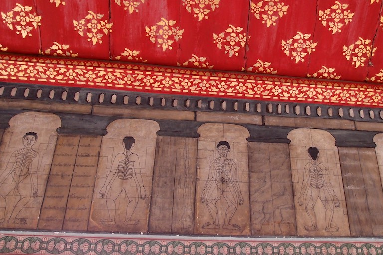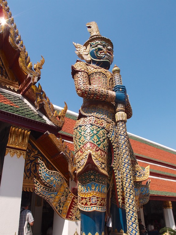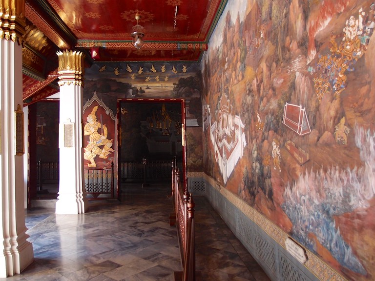 Byliśmy również w Pałacu Królewskim. Kompleks budynków zlokalizowany na ogromnej powierzchni. Popularność tego miejsca widać gołym okiem stojąc w długiej kolejce do wejścia. Tuż przy głównej bramie dokładnie sprawdzano czy ubiór turystów jest właściwy. Osoby zbyt skąpo odziane kierowane są do sklepu, w którym można zakupić spodnie i chusty. Śpiew mniszek, kadzidełka, pozłacane posągi buddy, ściany dokładnie wyłożone porcelaną to wszystko sprawia, że oo miejsce można oglądać cały dzień i jeszcze się wszystkiego nie zobaczy. Mnie zaczarowały malowidła ścienne. Precyzyjne wykonanie szczegółu oddawały poświęcenie z jakim powstały.