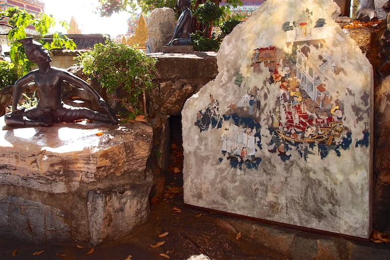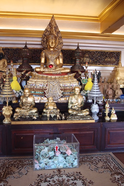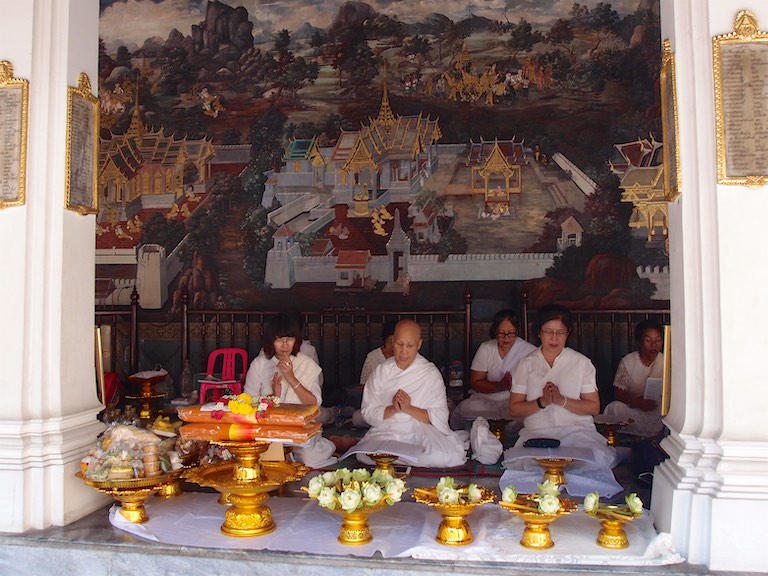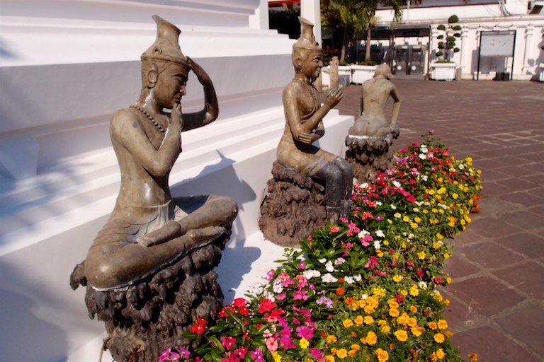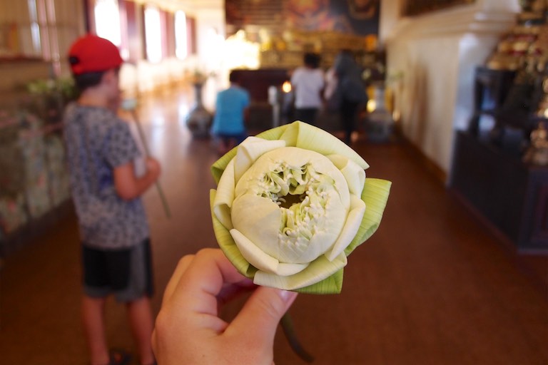 Na wzgórzu spotkaliśmy dużo osób oczekujący na zachód słońca, który stąd jest niesamowity otulając każdy budynek na widnokręgu. To stąd właśnie najlepiej widać jak „stare” miesza się z „nowym, a „biedne” z „bogatym”. W świątyni wierni składają kwiaty. Tajowie każdy kwiatek składają w szczególny sposób.