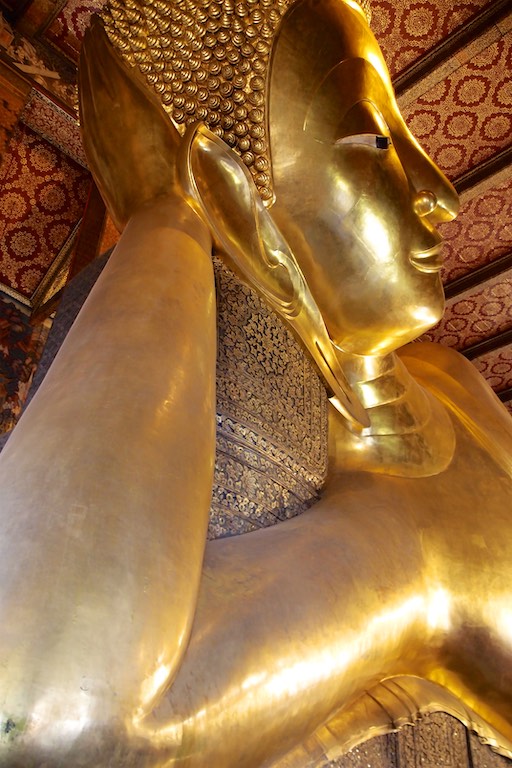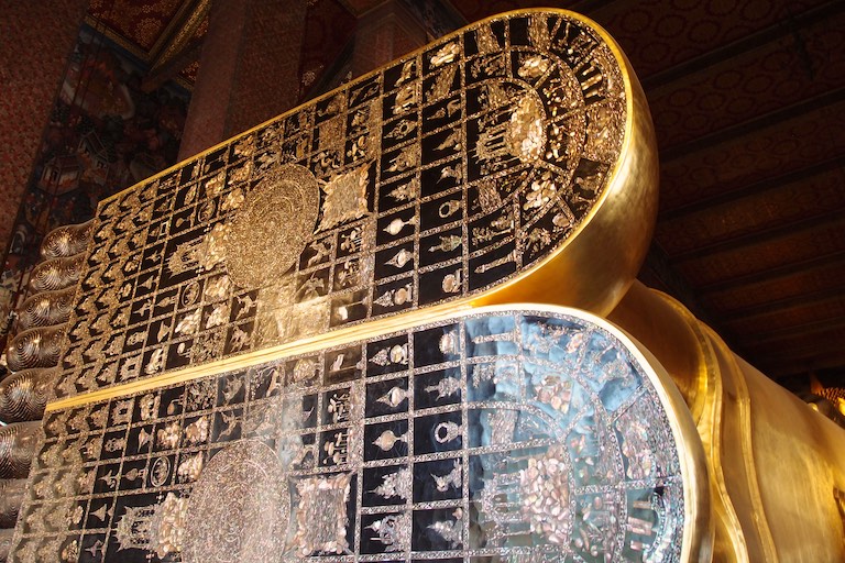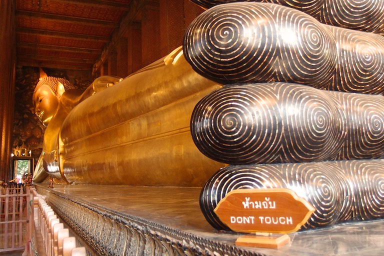 Po lunchu odwiedziliśmy Wat Pho, Świątynię Leżącego Buddy. Ten podobał mi się najbardziej i nie chodzi tu wcale o wymiary choć były imponujące 🙂 Długość Buddy równa była 46 metrom a wysokość 15 metrom. Budda był tak wysoki, że konieczne było zrobienie otworu w suficie bo lekko nie mieścił się do świątyni. Sama figura była bardzo ładna, ale najładniejsze były stopy Buddy :), które zostały wykonane z masy perłowej. Przedstawiają 108 symboli i stopni buddyjskiego oświecenia.