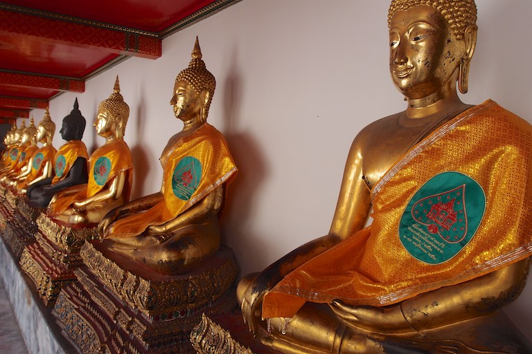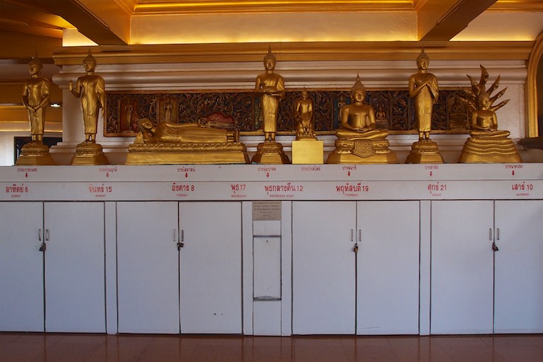 W zależności od dnia urodzin Budda przyjmuje inną postać. Mój Budda niedzielny ( pierwszy od lewej) wypada dość blado na tle innych. Poniedziałkowy Budda przez wyciągniętą przed siebie otwartą dłonią mówi stop. Przewodniczka mówi, że jest to ulubiony Budda europejskich turystów 🙂 biorąc pod uwagę, że to jedyny Budda, którego wszyscy naśladowaliśmy rozumiem dlaczego tak właśnie jest 🙂