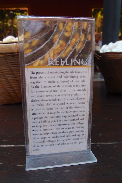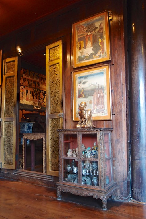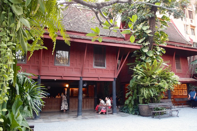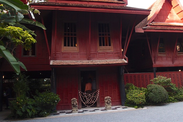 Nie mogliśmy przeoczyć również domu Jima Thompsona, wypełnionego pamiątkami zgromadzonymi podczas jego życia w Bangkoku. Dom utrzymany jest w starym stylu. Jim Thompson, podróżnik, architekt i w końcu biznesmen znany był przede wszystkim jako propagator jedwabiu. Przed jego domem można zobaczyć jak powstaje taka przędza. Kokon wykorzystuje się do tkania a z jedwabnika ( jak opowiadała przewodniczka) powstaje zupa. W lokalnym sklepie oczywiście można zakupić różne produkty z tajskiego jedwabiu. Sam dom Thompsona to kompleks kilku budynków wypełnionych pamiątkami i obrazami.