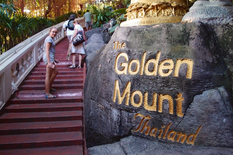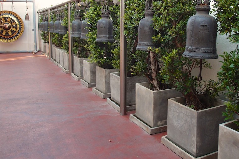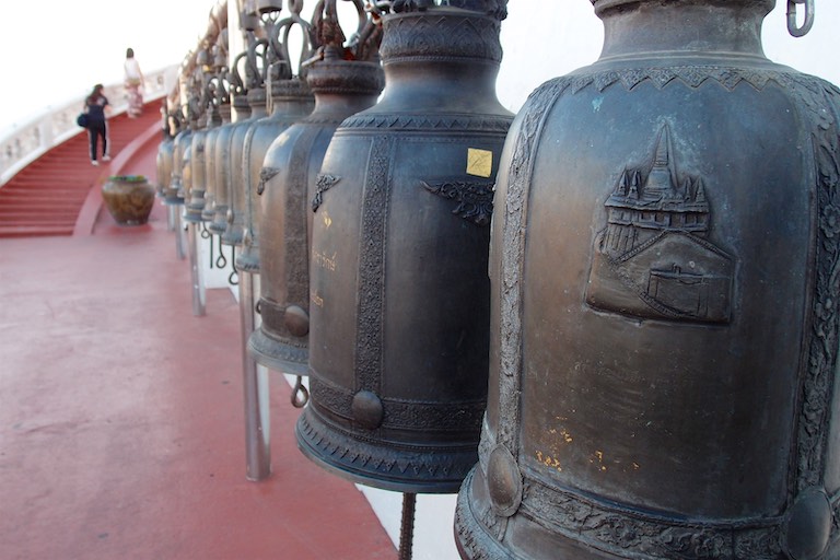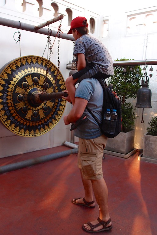 Na koniec zwiedzania Bangkoku udaliśmy się na jedyne w okolicy wzgórze, na szczycie którego znajduje się świątynia Wat Saket. Droga do niej prowadzi po 344 schodach, ale te schody to raczej niskie schodki 🙂 pokonuje się je błyskawicznie. Wspinaczkę umilają dzwony rozwieszone wzdłuż całej trasy. Szczególnie dzieci chciały dotknąć każdego z nich co pod koniec udzieliło się również nam. Przed wejściem umieszczono drzewo, na którym odwiedzający zawieszali złote serduszka z wypisanymi własnoręcznie na miejscu życzeniami. Serduszka finalnie ozłocą jakiegoś Buddę przez co staniemy się „fundatorami” tego ozłocenia 🙂