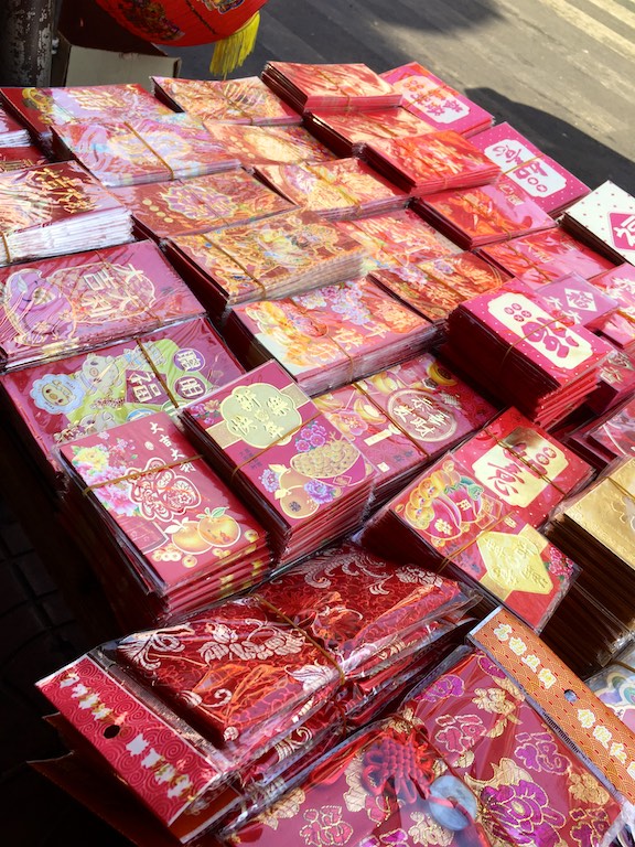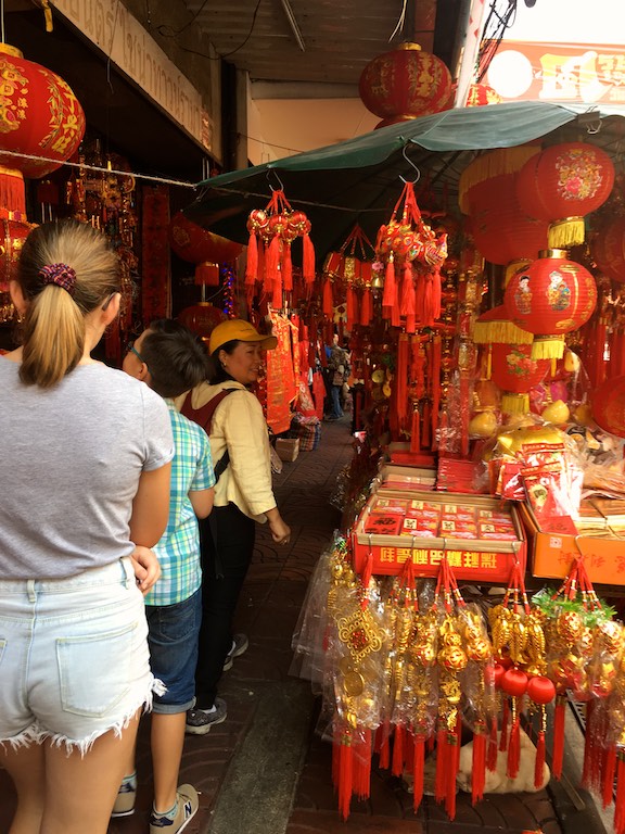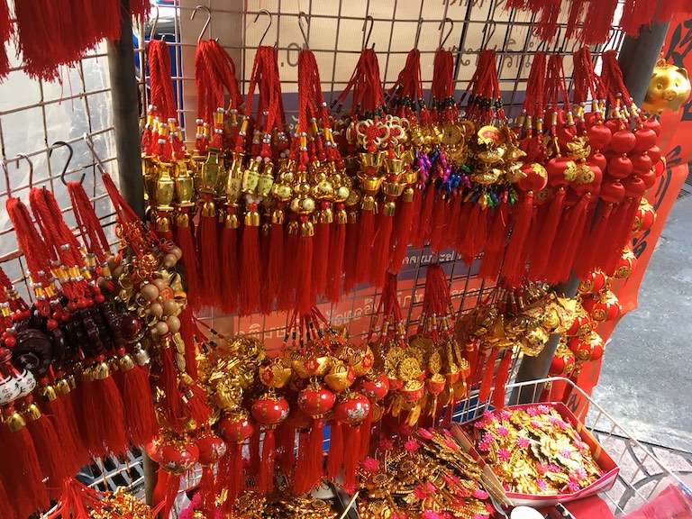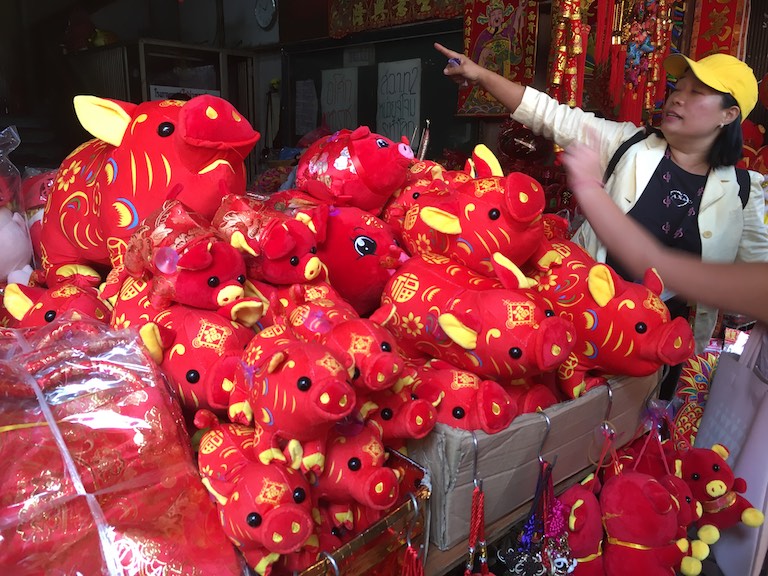 Do China Town było niedaleko, trzeba było przejść jedynie przez ulicę i w mgnieniu oka przenieśliśmy się w chińskie klimaty. Miejsce pełne ludzi i gwaru. Chodniki dokładnie oklejone wszelkiego rodzaju działalnością gospodarczą. Różnokolorowe potrawy serwowane wprost z ulicy mieszały się z tekstyliami. Wszystko to sprawiało wrażenie przeładowania. Stragany biły czerwonością i różnymi gabarytami pluszowych świnek bo rok 2019 w chińskim kalendarzu jest rokiem świni właśnie.