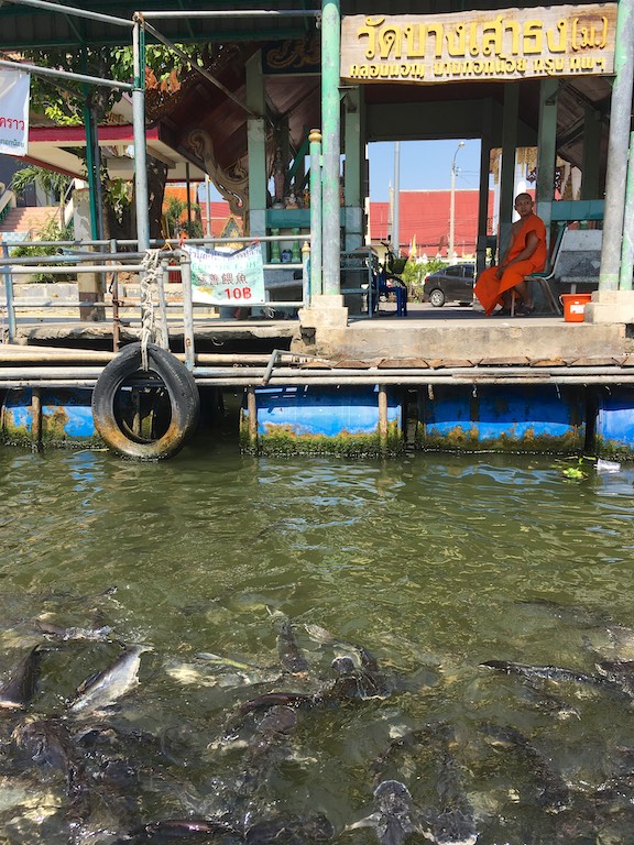 Podczas rejsu kanałami zatrzymaliśmy się na chwilkę by nakarmić ryby kupionym od mnichów chlebem. Tajowie wierzą, że karmienie ryb przyniesie szczęście.