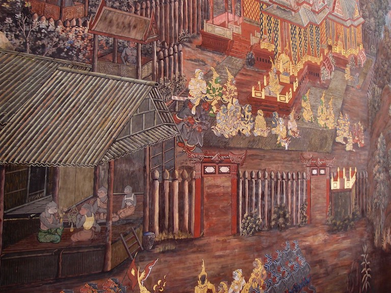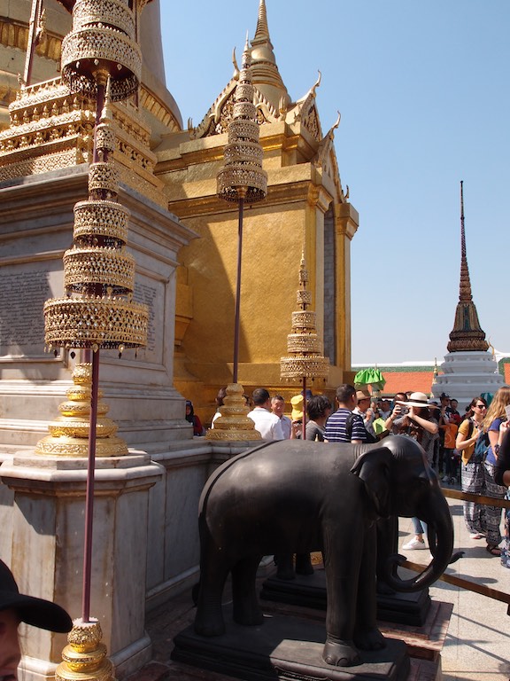 Byliśmy również w Pałacu Królewskim. Kompleks budynków zlokalizowany na ogromnej powierzchni. Popularność tego miejsca widać gołym okiem stojąc w długiej kolejce do wejścia. Tuż przy głównej bramie dokładnie sprawdzano czy ubiór turystów jest właściwy. Osoby zbyt skąpo odziane kierowane są do sklepu, w którym można zakupić spodnie i chusty. Śpiew mniszek, kadzidełka, pozłacane posągi buddy, ściany dokładnie wyłożone porcelaną to wszystko sprawia, że oo miejsce można oglądać cały dzień i jeszcze się wszystkiego nie zobaczy. Mnie zaczarowały malowidła ścienne. Precyzyjne wykonanie szczegółu oddawały poświęcenie z jakim powstały.