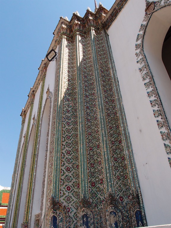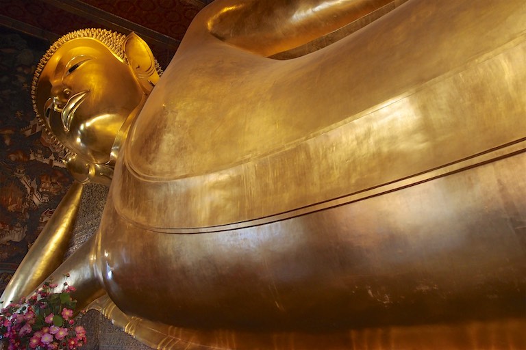 Po lunchu odwiedziliśmy Wat Pho, Świątynię Leżącego Buddy. Ten podobał mi się najbardziej i nie chodzi tu wcale o wymiary choć były imponujące 🙂 Długość Buddy równa była 46 metrom a wysokość 15 metrom. Budda był tak wysoki, że konieczne było zrobienie otworu w suficie bo lekko nie mieścił się do świątyni. Sama figura była bardzo ładna, ale najładniejsze były stopy Buddy :), które zostały wykonane z masy perłowej. Przedstawiają 108 symboli i stopni buddyjskiego oświecenia.