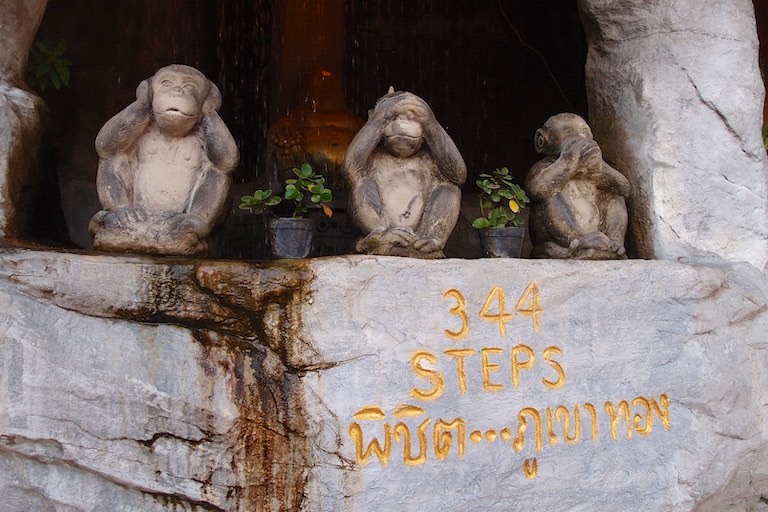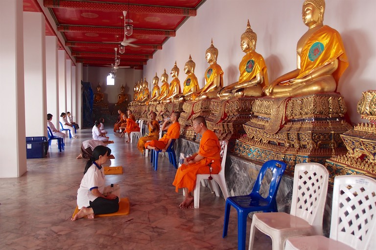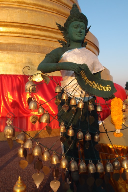 Na wzgórzu spotkaliśmy dużo osób oczekujący na zachód słońca, który stąd jest niesamowity otulając każdy budynek na widnokręgu. To stąd właśnie najlepiej widać jak „stare” miesza się z „nowym, a „biedne” z „bogatym”. W świątyni wierni składają kwiaty. Tajowie każdy kwiatek składają w szczególny sposób.