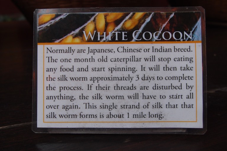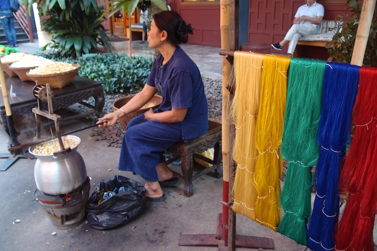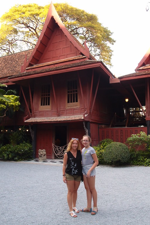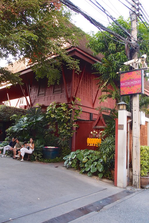 Nie mogliśmy przeoczyć również domu Jima Thompsona, wypełnionego pamiątkami zgromadzonymi podczas jego życia w Bangkoku. Dom utrzymany jest w starym stylu. Jim Thompson, podróżnik, architekt i w końcu biznesmen znany był przede wszystkim jako propagator jedwabiu. Przed jego domem można zobaczyć jak powstaje taka przędza. Kokon wykorzystuje się do tkania a z jedwabnika ( jak opowiadała przewodniczka) powstaje zupa. W lokalnym sklepie oczywiście można zakupić różne produkty z tajskiego jedwabiu. Sam dom Thompsona to kompleks kilku budynków wypełnionych pamiątkami i obrazami.