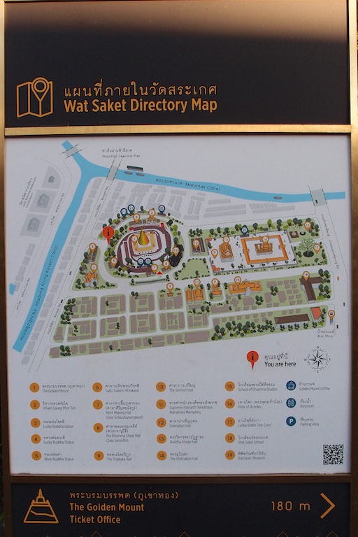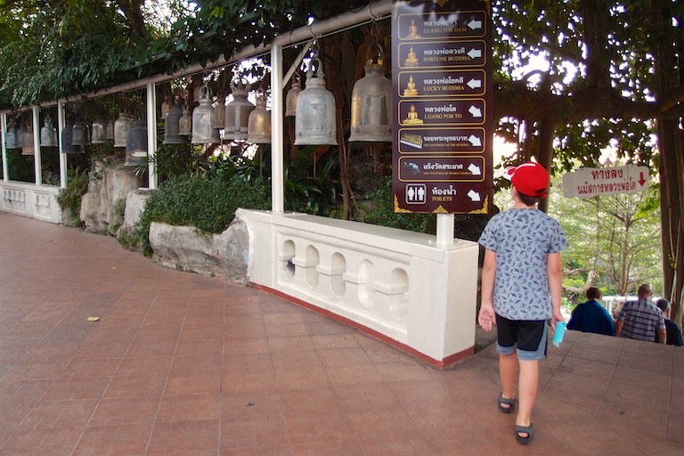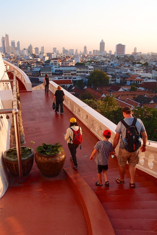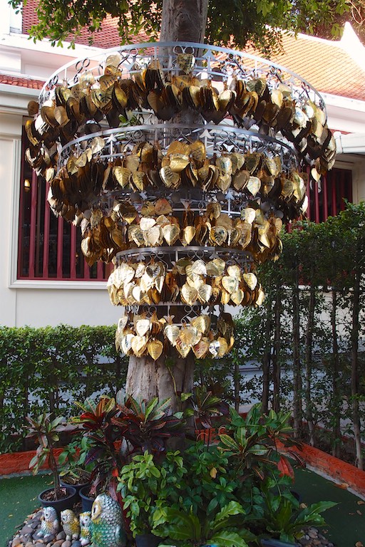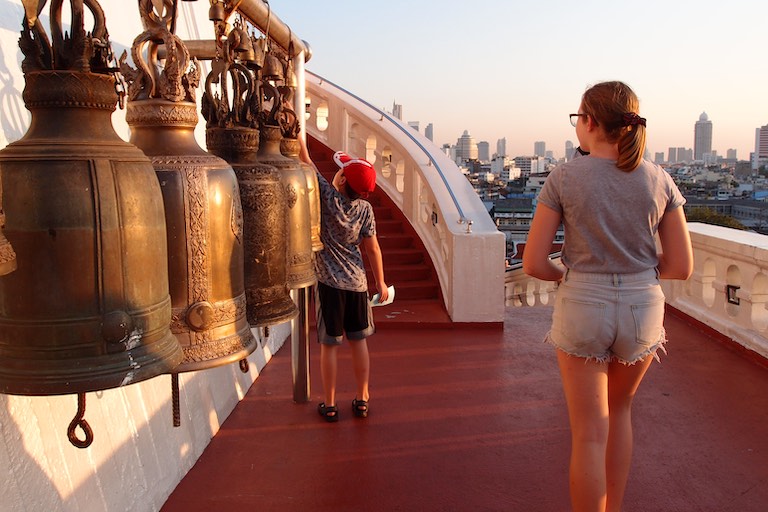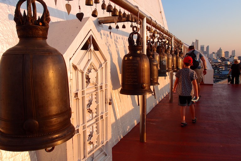 Na koniec zwiedzania Bangkoku udaliśmy się na jedyne w okolicy wzgórze, na szczycie którego znajduje się świątynia Wat Saket. Droga do niej prowadzi po 344 schodach, ale te schody to raczej niskie schodki 🙂 pokonuje się je błyskawicznie. Wspinaczkę umilają dzwony rozwieszone wzdłuż całej trasy. Szczególnie dzieci chciały dotknąć każdego z nich co pod koniec udzieliło się również nam. Przed wejściem umieszczono drzewo, na którym odwiedzający zawieszali złote serduszka z wypisanymi własnoręcznie na miejscu życzeniami. Serduszka finalnie ozłocą jakiegoś Buddę przez co staniemy się „fundatorami” tego ozłocenia 🙂