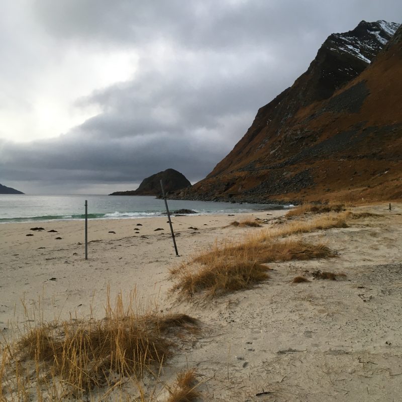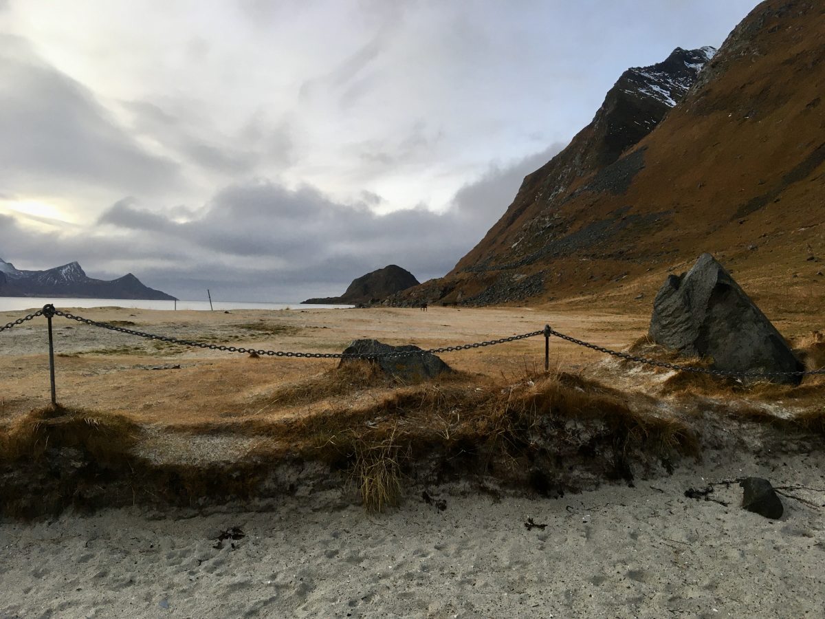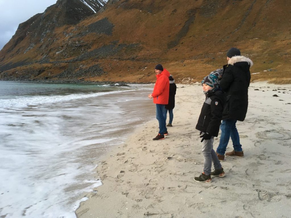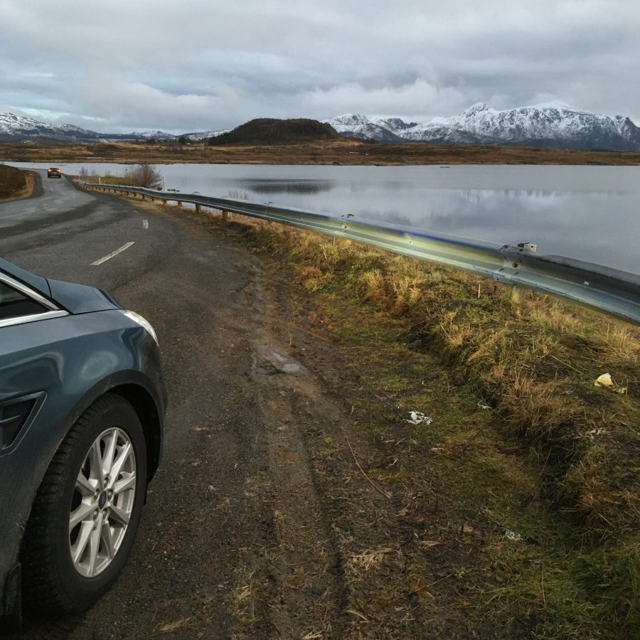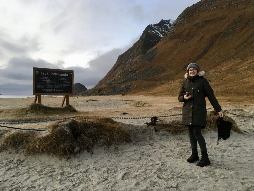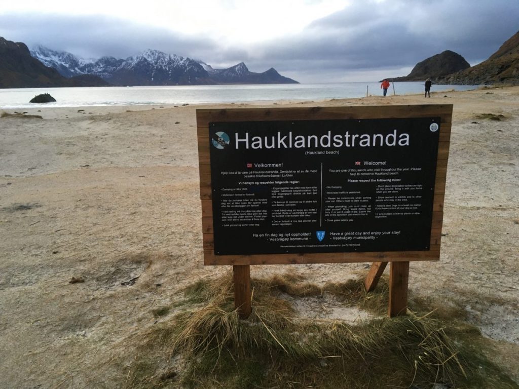 Korzystając z tego, że wynajęliśmy na lotnisku samochód jak i z tego, że nie padał deszcz a jeszcze było dość widno pojechaliśmy na plażę Hauklandstranda. Hauklandstranda znajduje się w środkowej części Lofotów, to północna część Vestvågøy, tylko 10 minut jazdy samochodem od Leknes. Plaża została wcześniej nazwana najpięknięszą plażą w Norwegii. Jest idealna ze względu na lokalizację, ponieważ można zaparkować tuż przy plaży i pospacerować a latem z pewnością można wykąpać się z pięknym widokiem na fiordy.