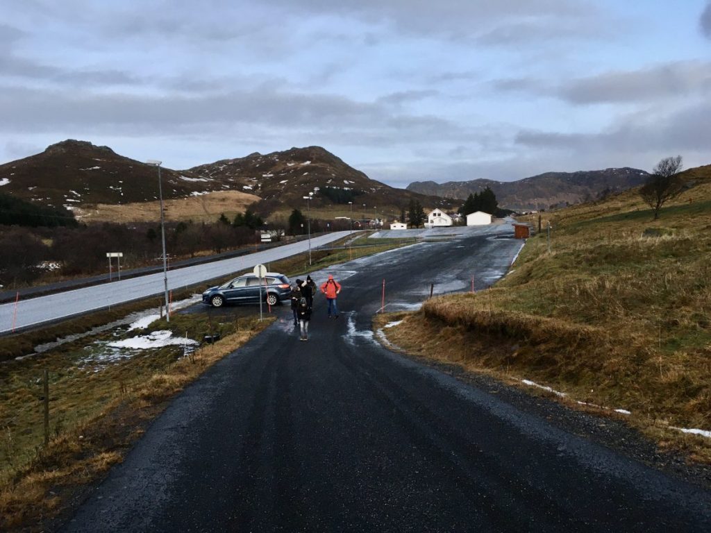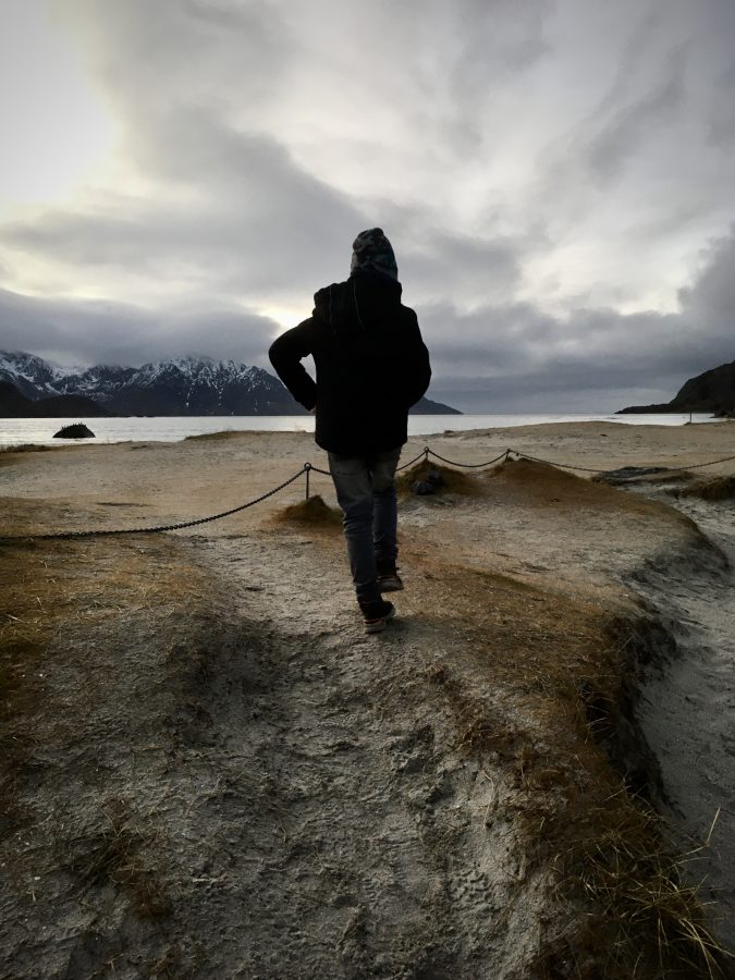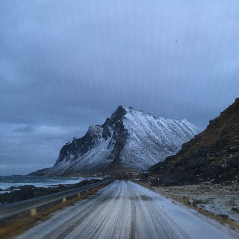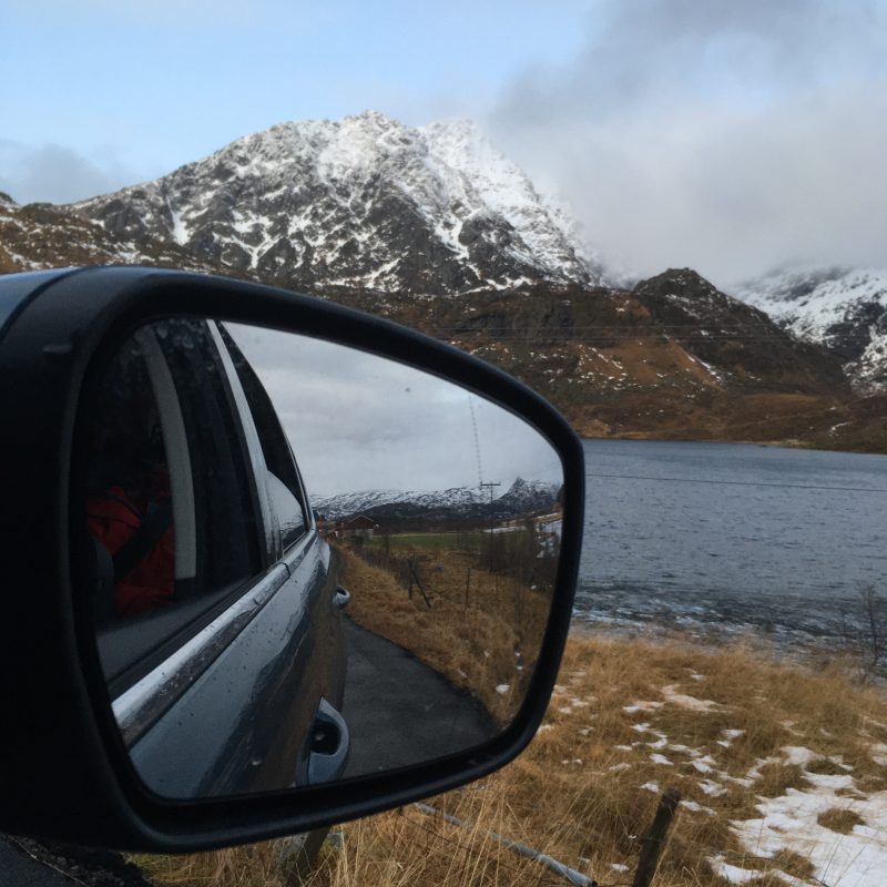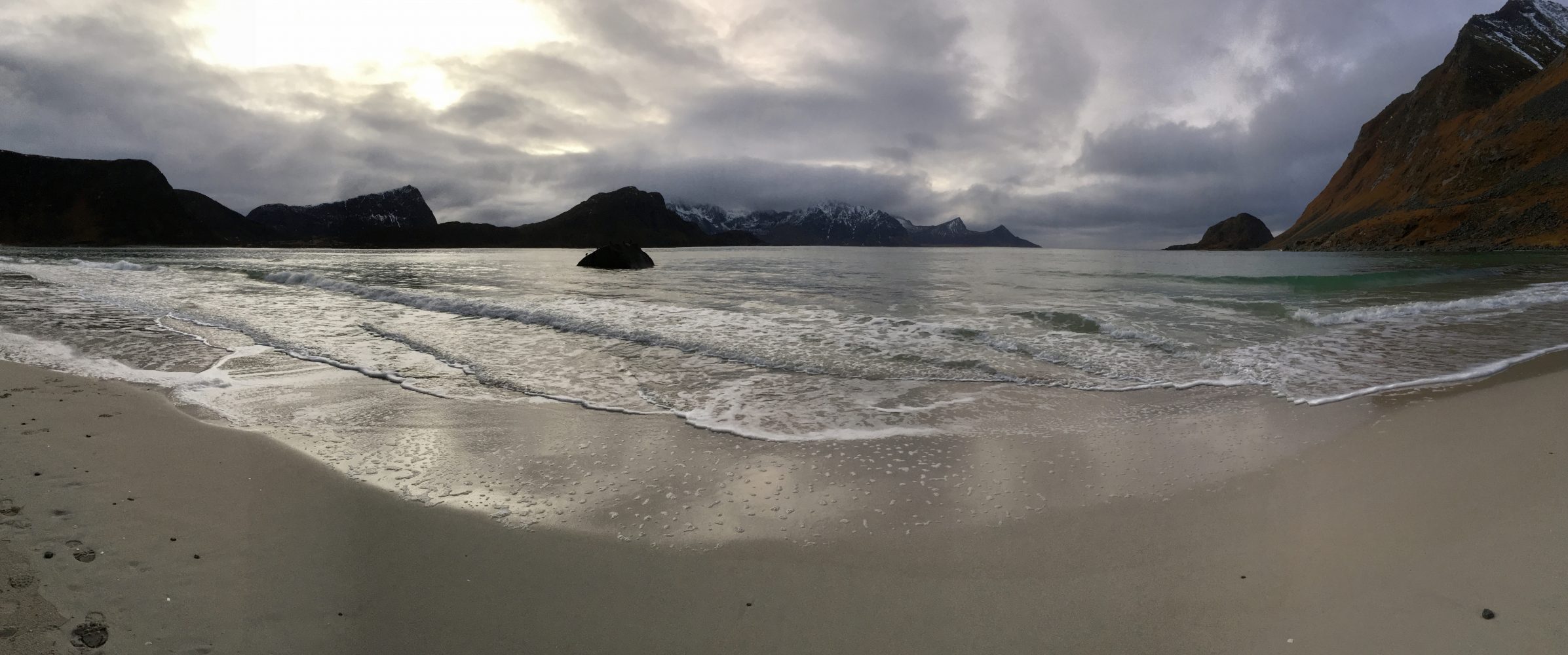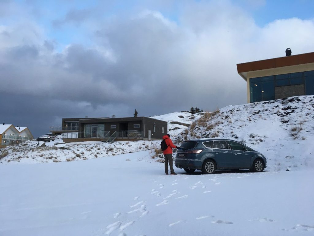 Korzystając z tego, że wynajęliśmy na lotnisku samochód jak i z tego, że nie padał deszcz a jeszcze było dość widno pojechaliśmy na plażę Hauklandstranda. Hauklandstranda znajduje się w środkowej części Lofotów, to północna część Vestvågøy, tylko 10 minut jazdy samochodem od Leknes. Plaża została wcześniej nazwana najpięknięszą plażą w Norwegii. Jest idealna ze względu na lokalizację, ponieważ można zaparkować tuż przy plaży i pospacerować a latem z pewnością można wykąpać się z pięknym widokiem na fiordy.