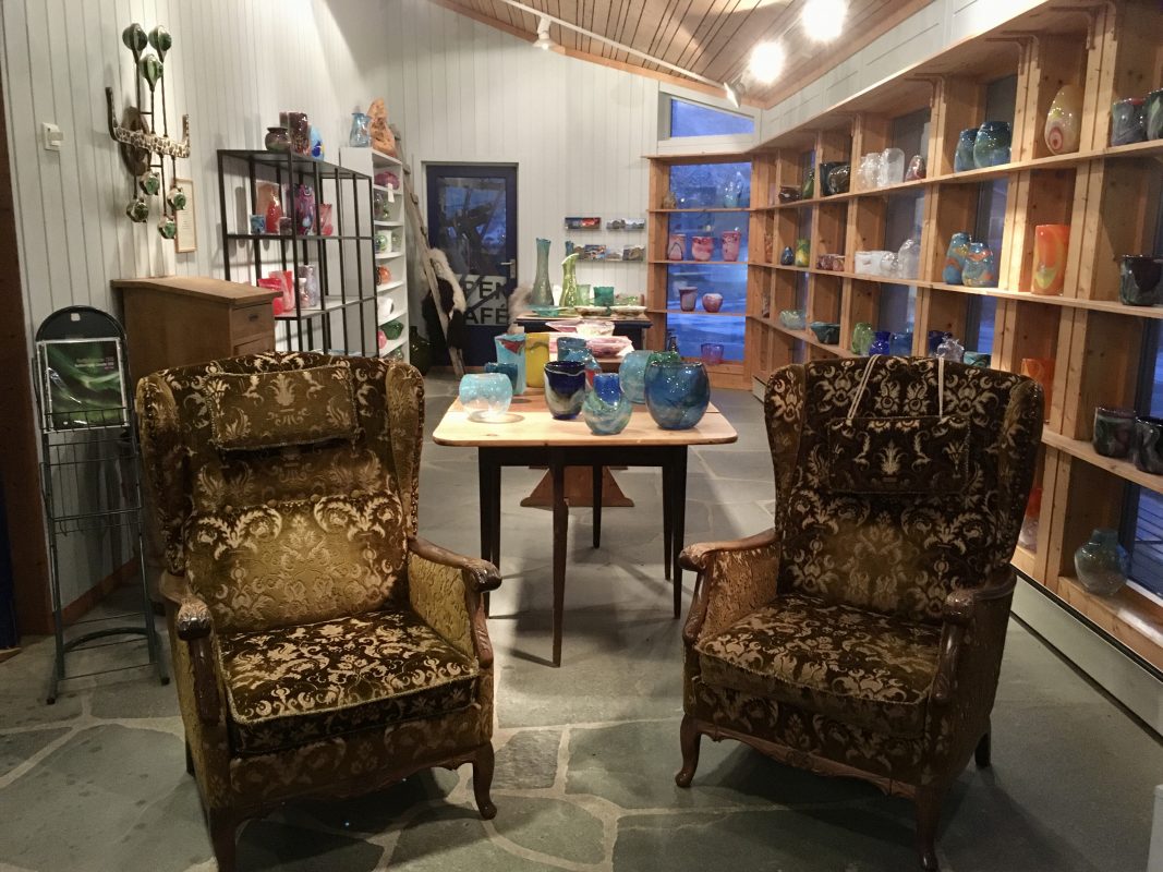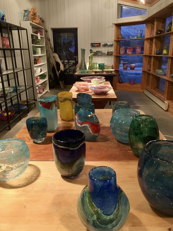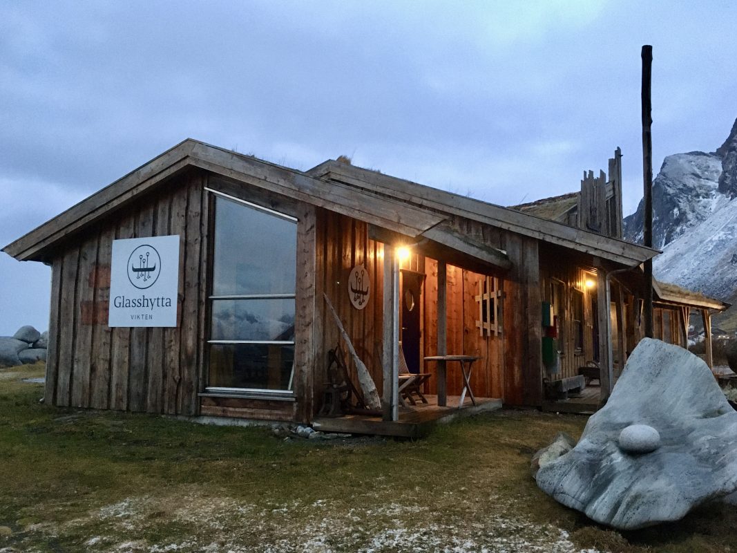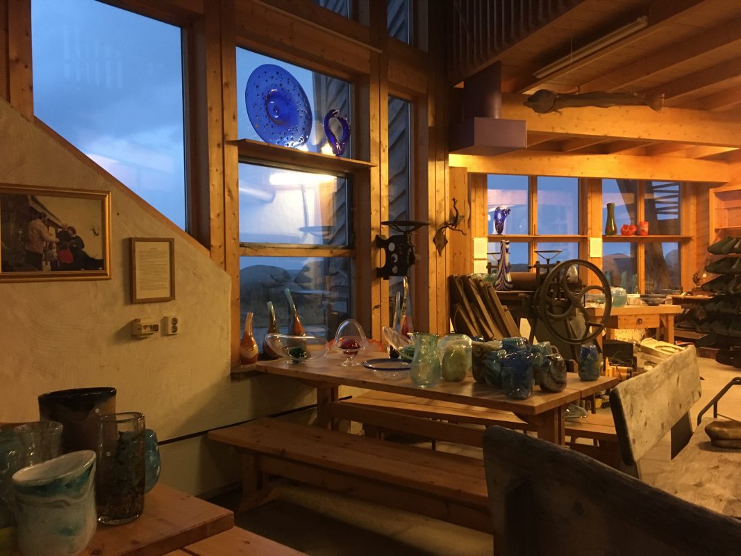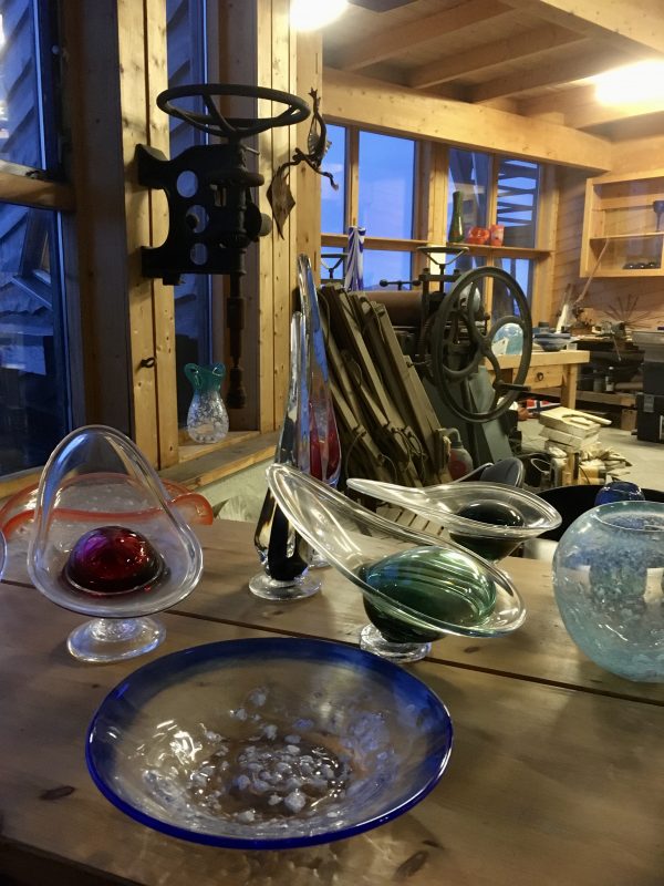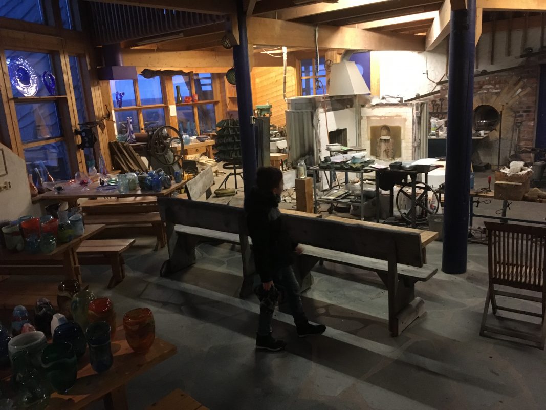 Gdy tylko wstał nowy dzień , spakowaliśmy się do auta i pojechaliśmy do Vikten, gdzie tuż przy linii brzegu u podnóża gór znaleźliśmy maleńką hutę szkła Glasshytta. Oczywiście był to ostatni dzień 2019 roku i było zamknięte dla zwiedzających. Dzięki temu, że zaglądnęliśmy jednak do środka okazało się, że właściciel, który jednocześnie był dmuchaczem szkła był wewnątrz 🙂 takie oto szczęście w nieszczęściu. Pootwierał dla nas wszystkie wnętrza. Dzieci mogły pooglądać szklane cuda i linię produkcyjną. Dowiedzieliśmy się również od niego, że w okolicy jest dużo Polaków i na przykład szkoła w Leknes budowana była przez Polaków.