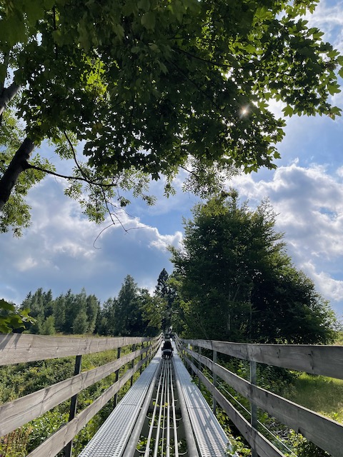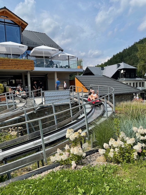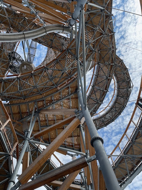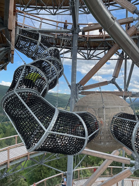 Podziemna trasa nie jest wymagająca i czasochłonna. Spędziliśmy w niej ok 40 minut. Będąc w okolicy pojechaliśmy do Świeradowa na Sky Walk. Niewinnie wyglądająca konstrukcja bardzo zachęcała do spaceru w chmurach szczególnie dzieci, dla których była nie lada atrakcją. Spacer na sam szczyt uprzyjemniony był podziwianiem fantastycznej panoramy. Okoliczne domy z każdym krokiem w górę stawały się mniejsze a wieża momentami zdawała się kołysać. Z wierzchołka na sam dół można zjechać tunelem. Nie było nawet mowy byśmy ominęli ten punkt zwiedzania. Mało tego… chęci starczyło nawet na ponowny spacer i zjazd.