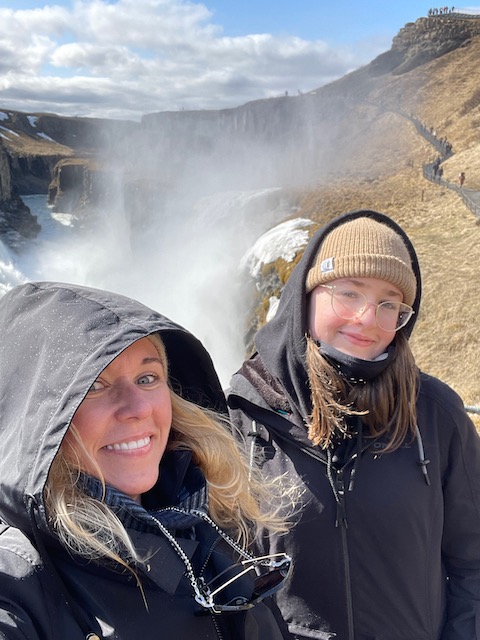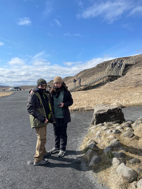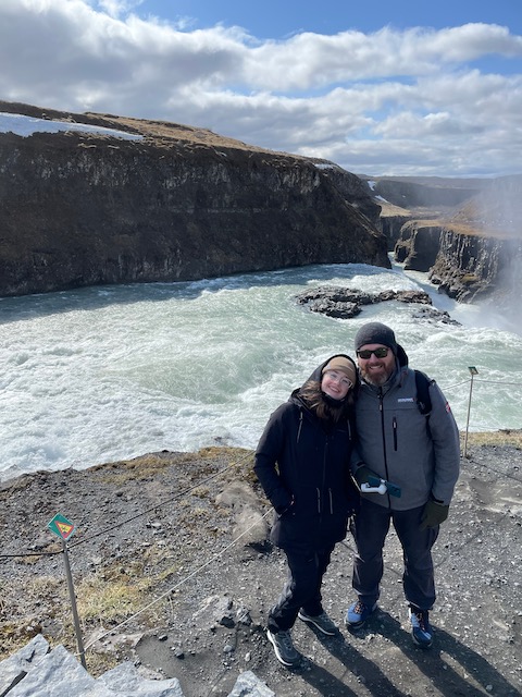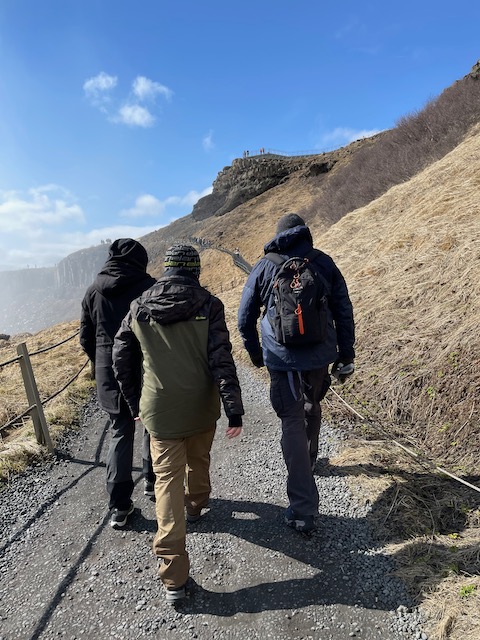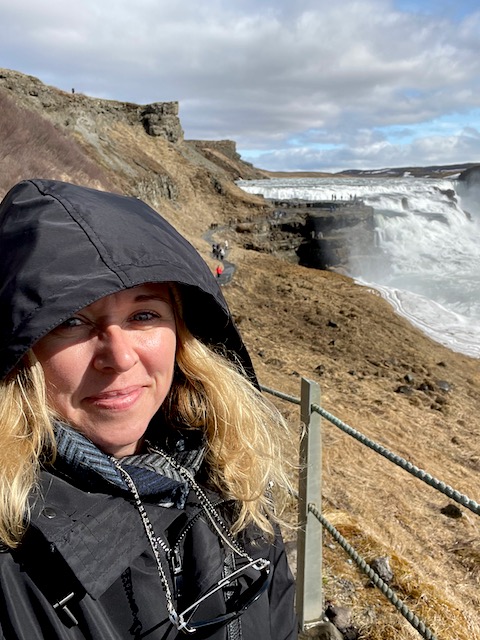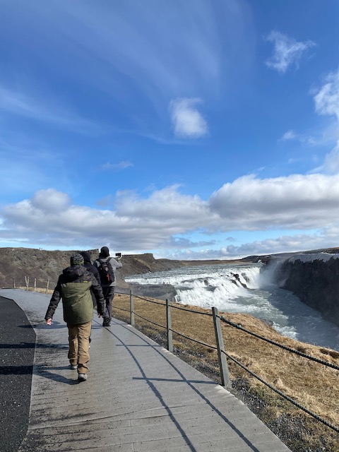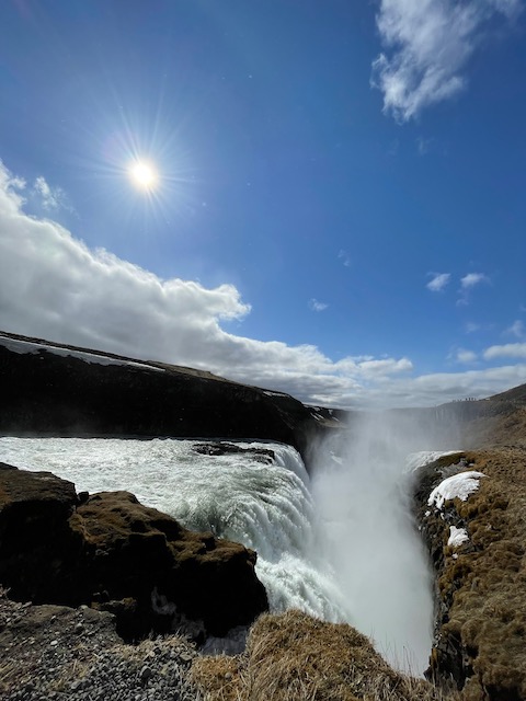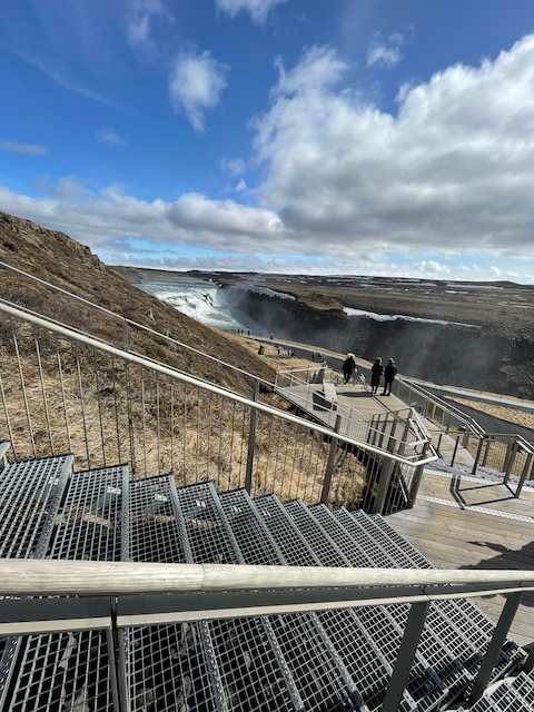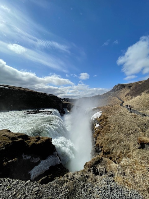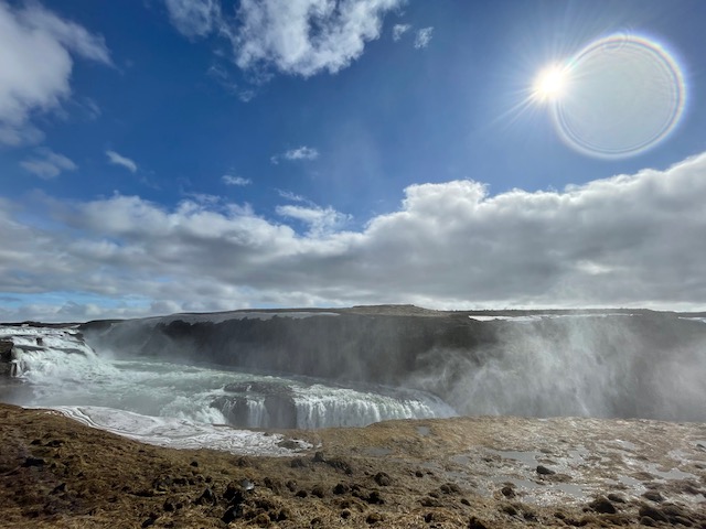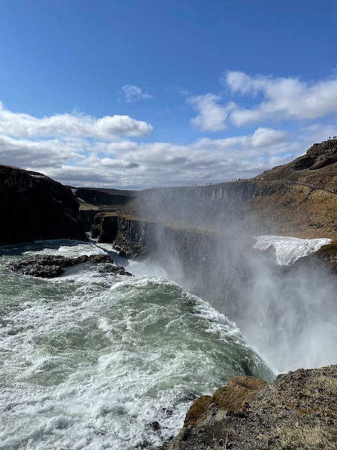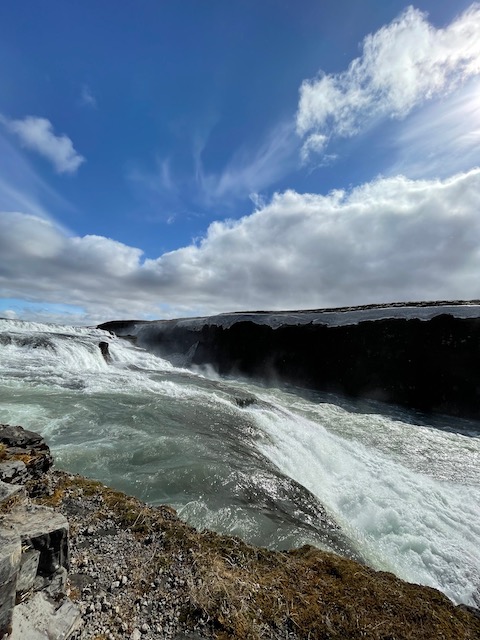 Drugim miejscem naszej wycieczki był wodospad Gullfoss. Tworzy go woda z rzeki Hvítá opadająca do kanionu Gullfossgjúfur. Hvítá jest rzeką lodowcową, której woda płynie pokonując 40 km po to by z impetem spaść z wysokości kilkunastu metrów (latem spada około 140 metrów sześciennych wody na sekundę więc siłę tego wodospadu można odczuć stojąc w pobliżu). Gullfoss to największy, złożony z dwóch kaskad wodospad na Islandii.