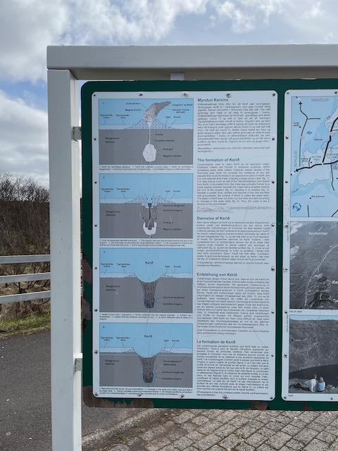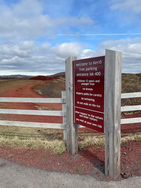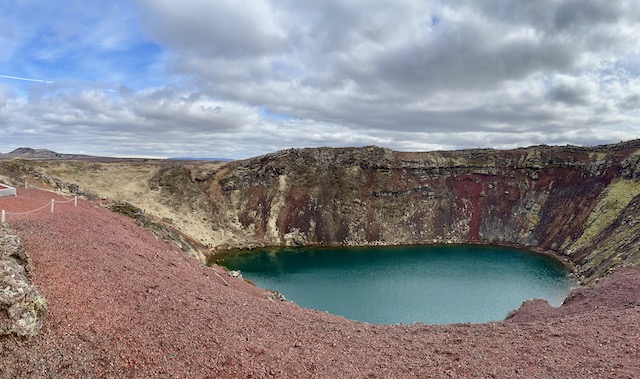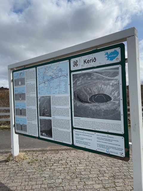 Najedzeni ruszyliśmy dalej. Po drodze natrafiliśmy na Kerið, wulkaniczne jezioro kraterowe. Nie mieliśmy w planie zwiedzania, ale Islandia ma to do siebie, że przemierzając powulkaniczne krajobrazy południowej części kraju już z daleka widać ciekawe punkty a przejeżdżając tak blisko, żal nie zatrzymać się choć na chwilę. Jezioro ma 55 metrów głębokości i można obejść je dookoła. Położenie 15 km od Selfoss sprawia, że jest chętnie odwiedzane przez turystów. Wstęp jest płatny.