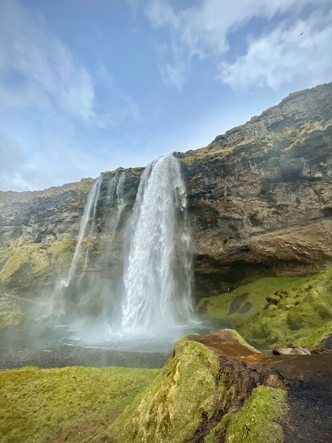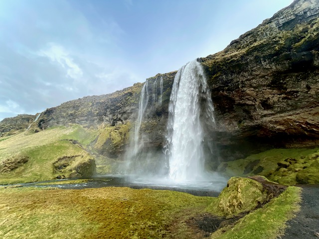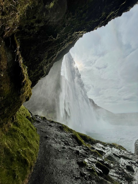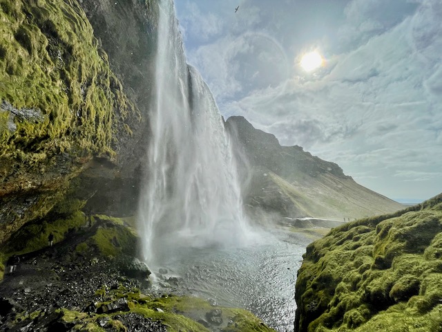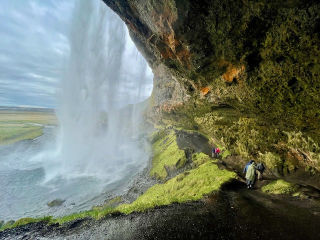Jadąc dalej trafiliśmy pod wodospad, który chyba zna cały świat bo jest to najwdzięczniejszy ze wszystkich wodospadów jakie widzieliśmy. Dodatkową atrakcją jest to, że można oglądnąć go z każdej strony. Dopinając szczelnie kurtki przeciwdeszczowe weszliśmy najpierw po schodach w jego pobliże po to by wśliznąć się kamienną ścieżką tuż za niego. Przydały się długie, nieprzemakalne płaszcze, które ochroniły nas choć trochę przed lejącą się z góry wodą. Wyszliśmy trochę mokrzy, ale frajda była wielka.