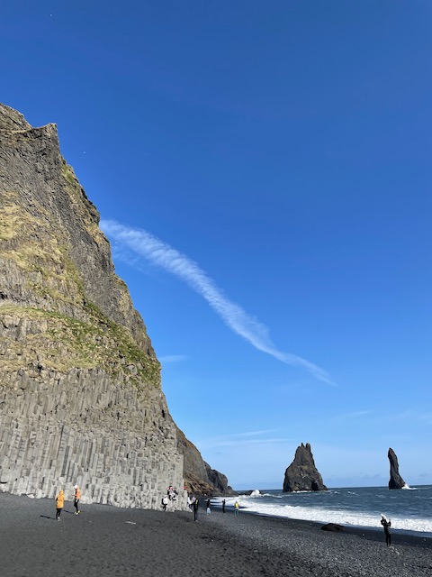 Mieliśmy wyjątkowe szczęście bo lepszej pogody na odwiedzenie tego miejsca nie mogliśmy sobie wymarzyć. Reynisfjara jest najładniejszą plażą z czarnym piaskiem na Islandii, a przez National Geographic została również okrzyknięta jedną z 10 najładniejszych plaż położonych z dala od klimatu tropikalnego. Bazaltowe skały, które pojawiły się w tym miejscu są wynikiem pękania lawy, która po wybuchu wulkanu zaczęła szybko stygnąć w klimacie lodowcowym. Legenda głosi, że dawno temu, trole uprowadziły kobietę, której mąż w akcie rozpaczy zamroził je. Są teraz przestrogą dla innych. Inna legenda mówi o trolach, ciąglących za sobą statek o trzech masztach. Ciągnęły go tak długo, że zmieniły się w kamień.