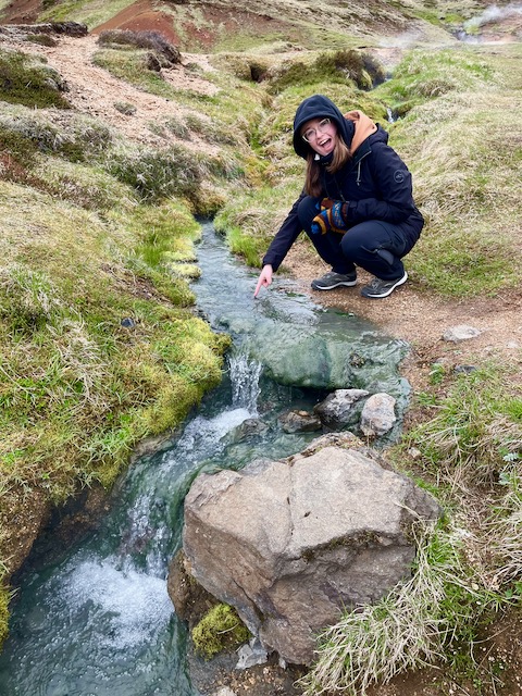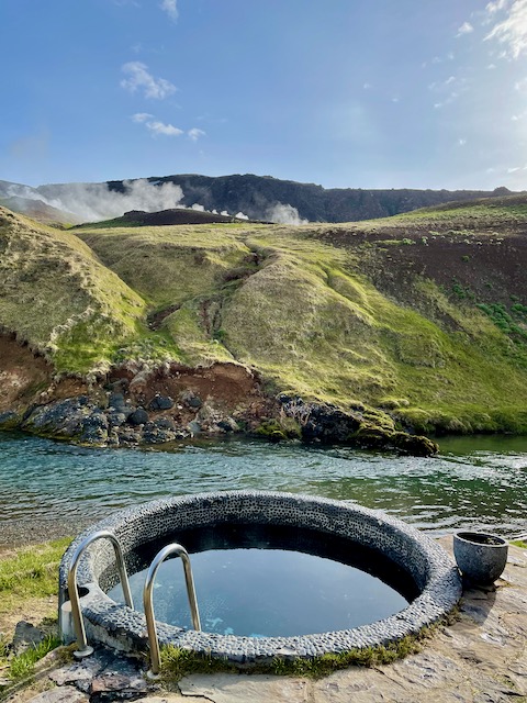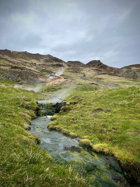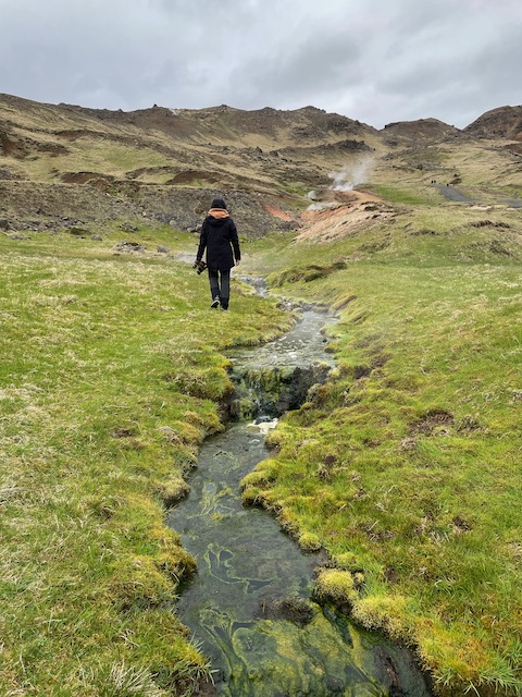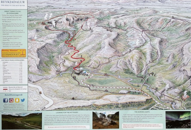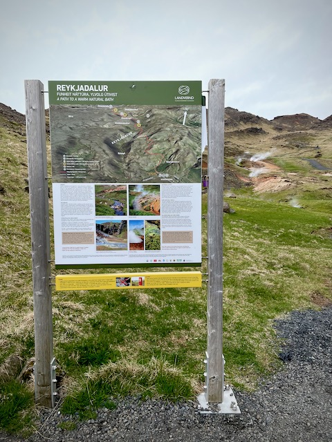 Całe szczęście nie przyjechaliśmy w tę okolicę po to by siedzieć w hotelu a żeby podziwiać dolinę Reykjadalur, której nazwa to nic innego jak „Dolina parowa”. Całość jest częścią obszaru geotermalnego należącego do wulkanu Hengill. W dolinie znajdują się gorące źródła, błotne baseny i gorąca rzeka, która staje się cieplejsza w miarę wędrówki w górę doliny. Miejsce przyciąga wszystkich amatorów kąpieli bo woda o każdej porze jest ciepła. Trzeba jednak uważać bo niektóre źródła są zaskakująco gorące i można się poparzyć.
