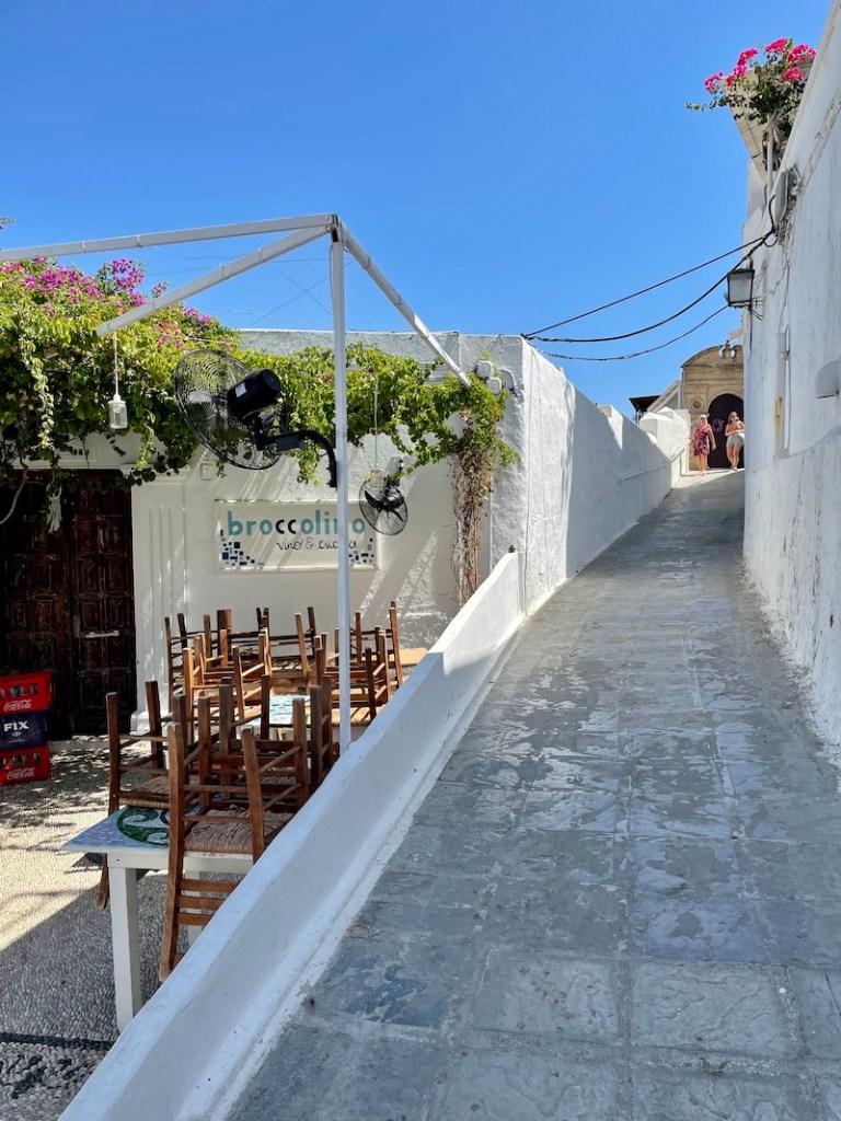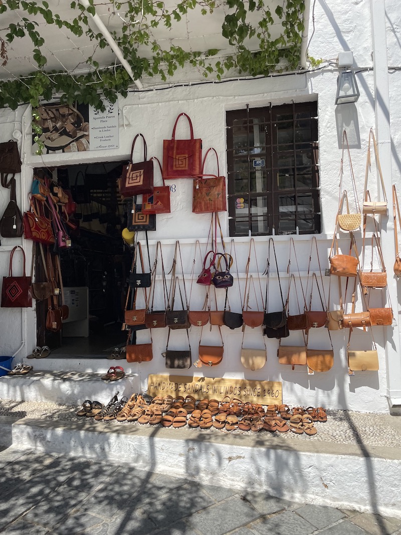 Białe Lindos to też sklepy z pamiątkami, wyrobami ze skóry, restauracyjki gdzie można posmakować lokalnych dań.