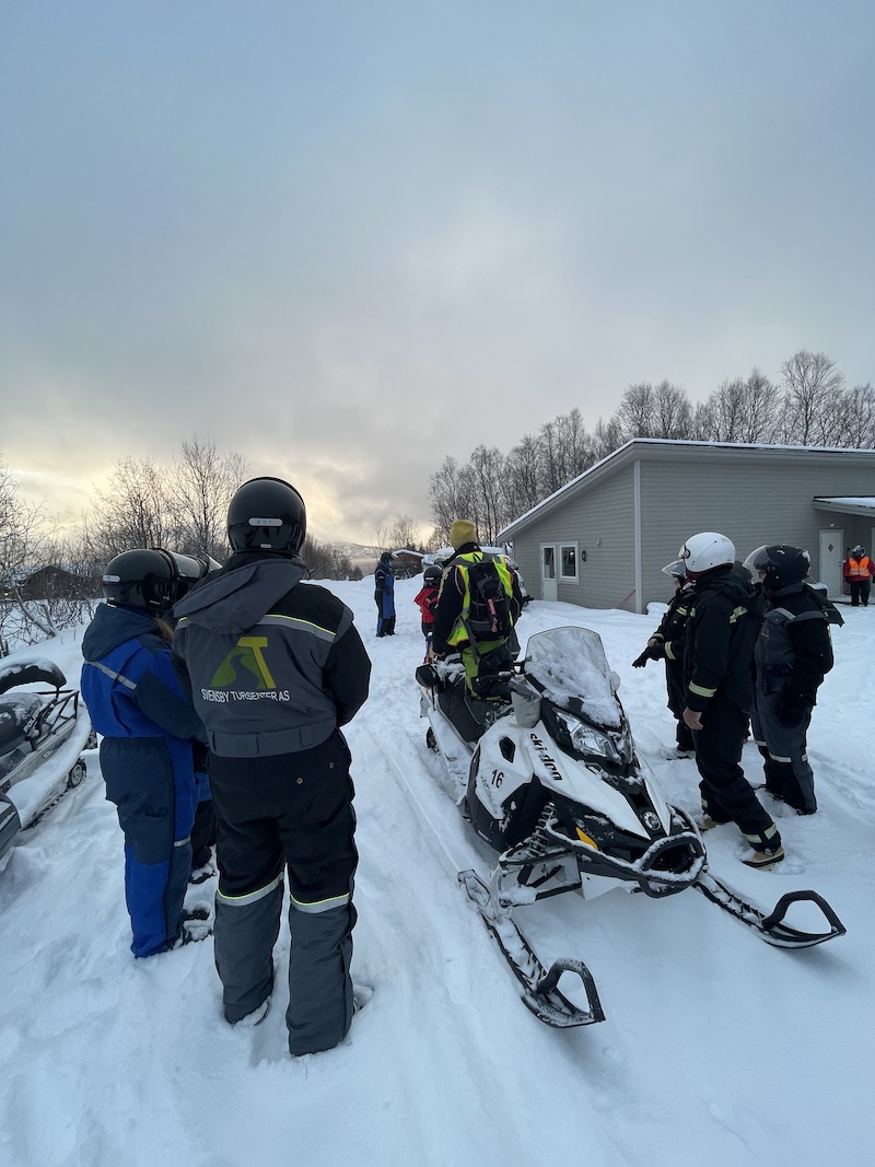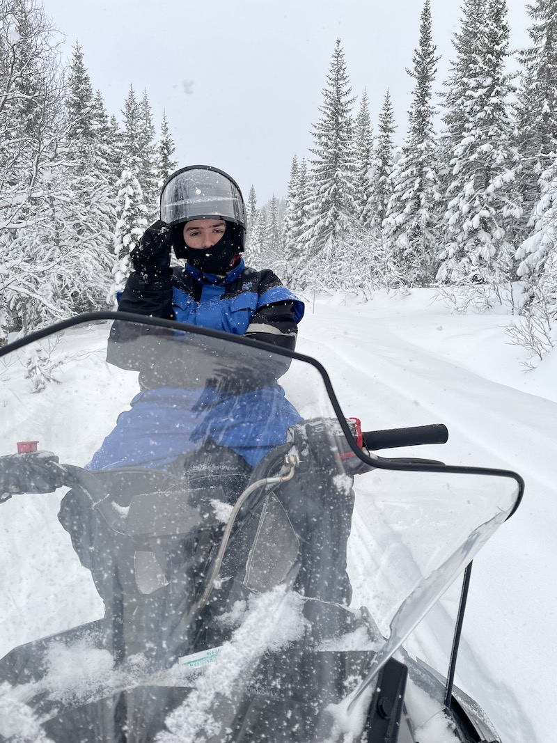 Po krótkim instruktarzu wsiedliśmy na skutery. W Norwegii skuter może prowadzić osoba posiadająca prawo jazdy więc wykluczone są z tego dzieci. W dwuosobowych zespołach wyruszyliśmy drogą przez las podziwiając zaśnieżoną okolicę. Trasa wiodła przez góry i zamarznięte jezioro. Po drodze był czas na zrobienie pamiątkowych zdjęć, wypicie gorącego kakao, które przygotował dla nas organizator i ogrzanie się przy palenisku w drewnianym domku.