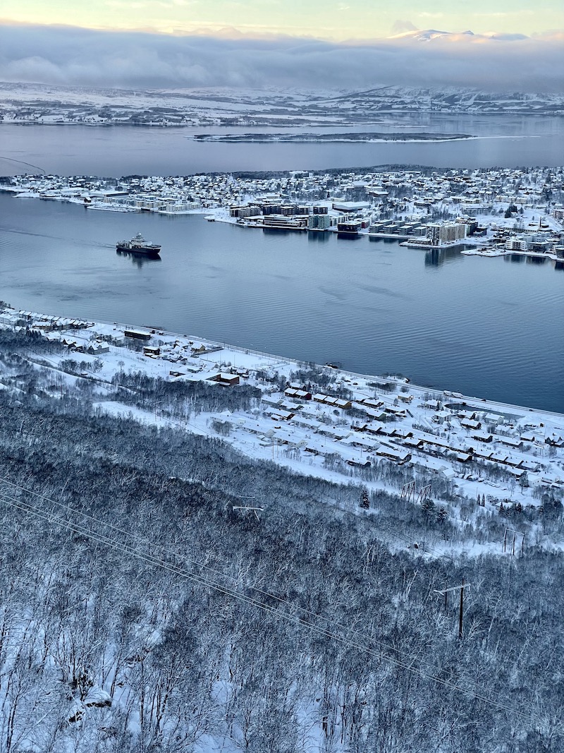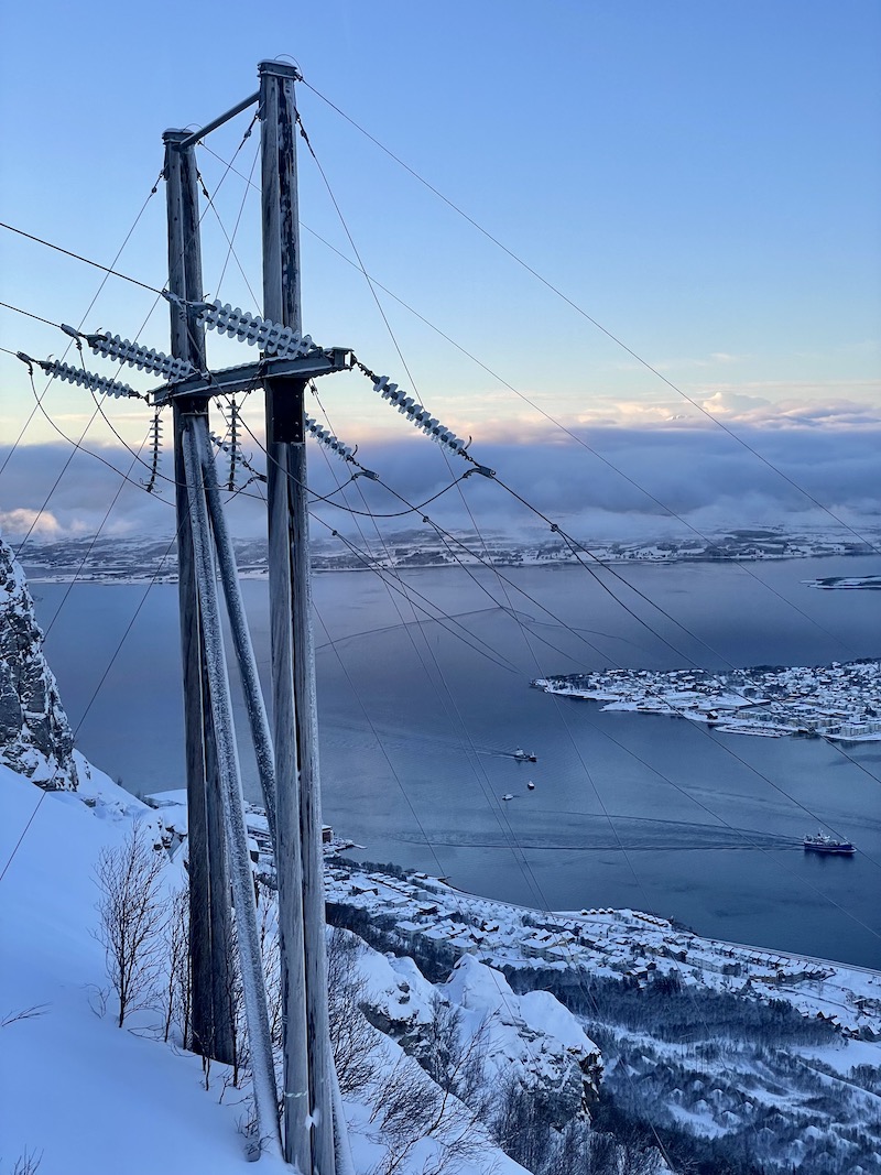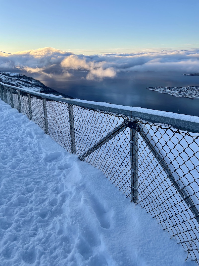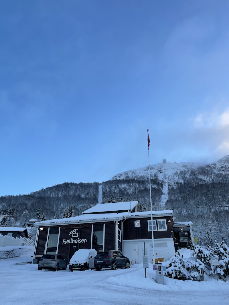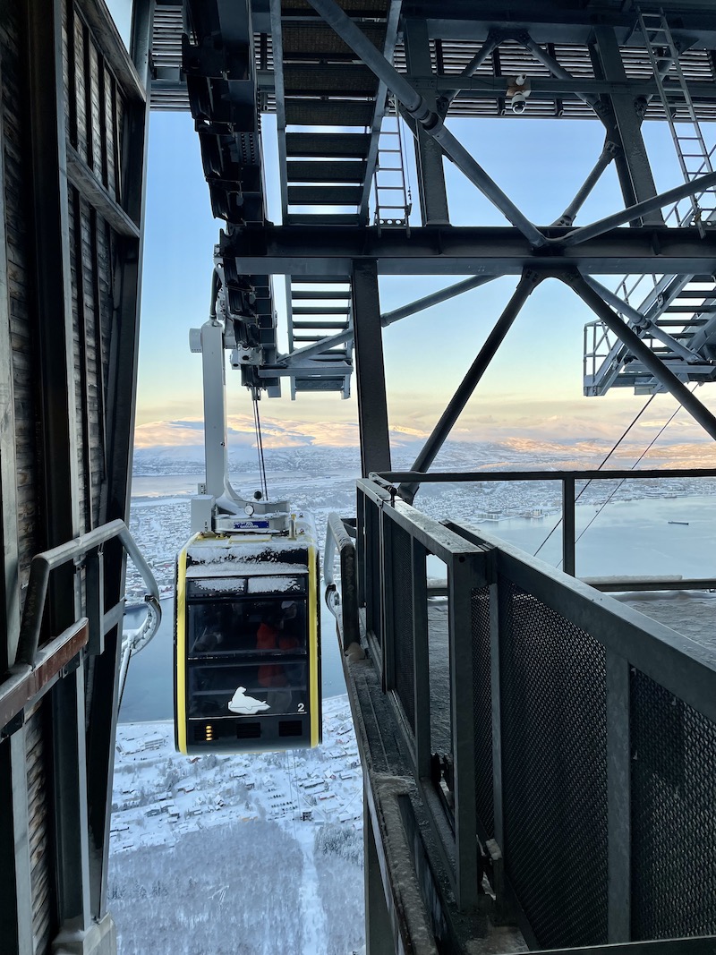 Fjellheisen. Gondola z widokiem na wyspę. Warto wjechać na szczyt by z wysokości 420 metrów n.p.m. móc podziwiać panoramę całego Tromsø, które otoczone górami często przykrywają chmury. Spacer z centrum miasta do dolnej stacji kolejki zajmuje około 45 minut. Alternatywnie można wybrać dojazd autobusem nr 26 ( dojazd zajmuje ok 15 minut) spod pizzerii Peppes.