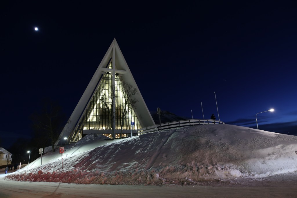 Katedra Arktyczna w Tromsø. Majestatyczna bryła katedry widoczna jest z daleka. Żeby do niej dotrzeć trzeba pokonać 1036 metrowy most łączący dzielnicę Tromsdalen na kontynencie i wyspę Tromsøya. Miły spacer uprzyjemnia podziwianie widoków na miasto i port.