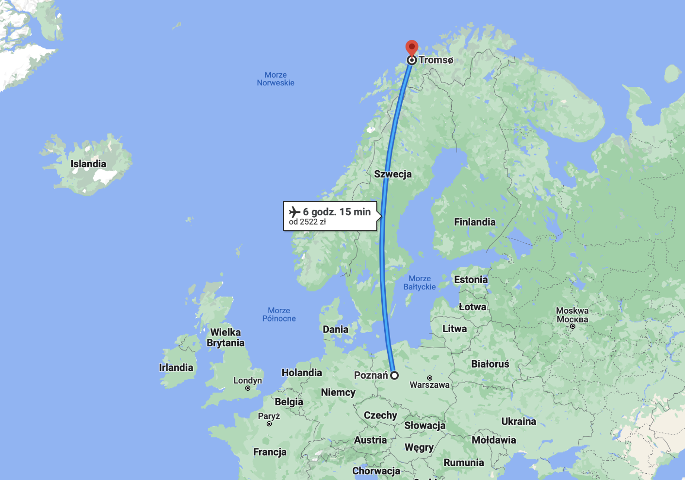 Najszybszym sposobem, żeby dostać się do Tromsø z Polski jest oczywiście samolot. Tanie linie lotnicze WizzAir oferują bezpośrednie połączenia z portu lotniczego w Gdańsku. Jedne z tańszych lotów jakie można spotkać na tej trasie to loty w cenie 69 zł za osobę za lot w jedną stronę, z bagażem podręcznym. Jednak normalna cena za bilet to ok. 200zł. Waha się ona w zależności od terminu lotu ( najdrożej jest zimą a najtaniej latem) i może dochodzić do ok. 800zł za lot w jedną stronę.