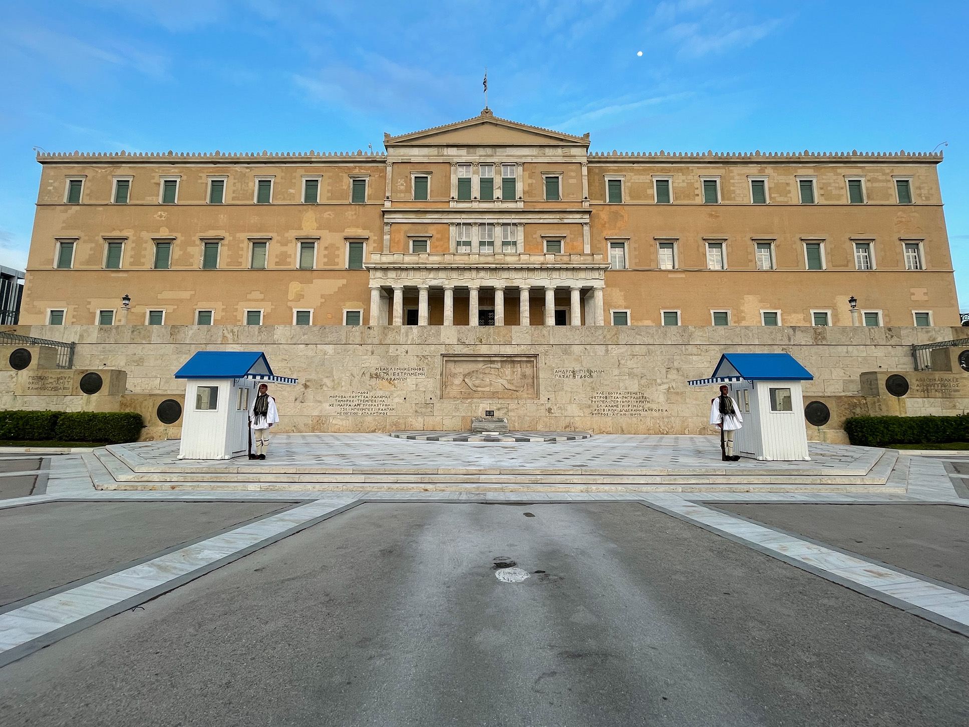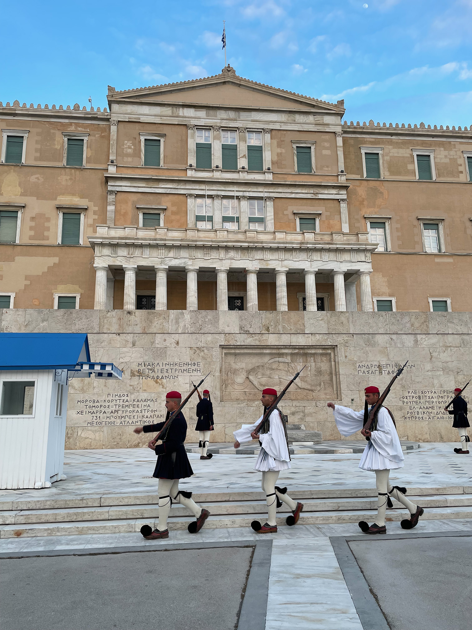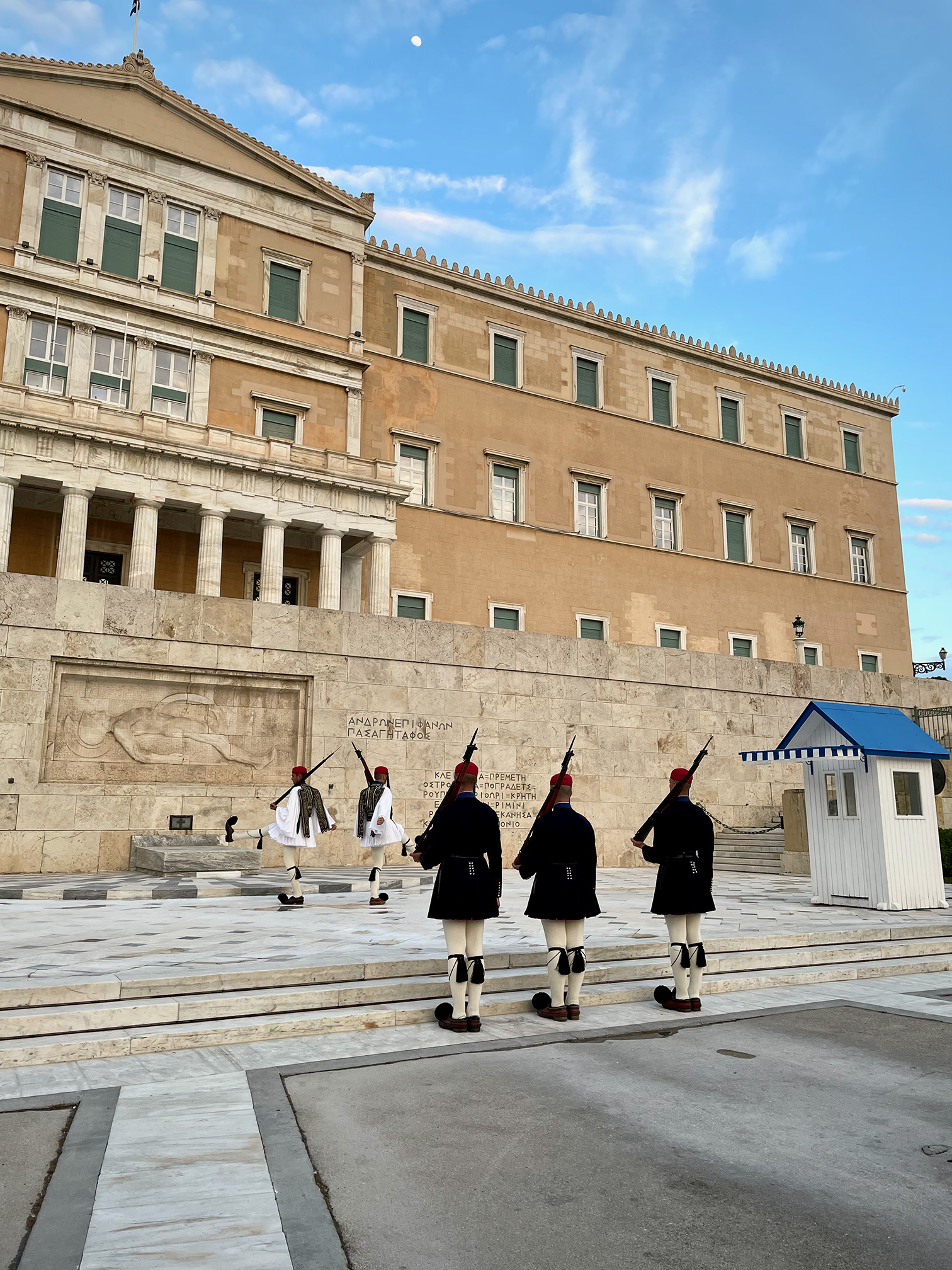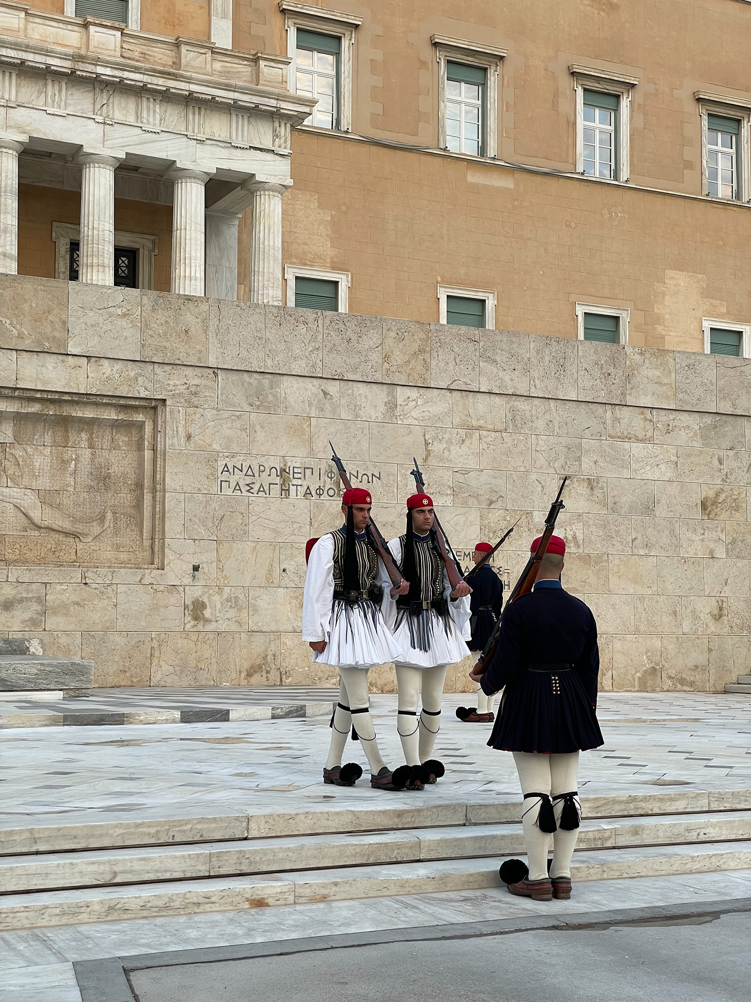 Na placu Syntagma przy Grobie Nieznanego Żołnierza grecka reprezentacja wojskowa ( Ewzoni) w sposób spektakularny dokonuje zmiany warty. Jak nie trudno się domyśleć można tu spotkać tłum turystów, którzy w milczeniu śledzą każdy ruch żołnierzy. Ceremonia zmiany warty przebiega według takiego samego schematu co godzinę.