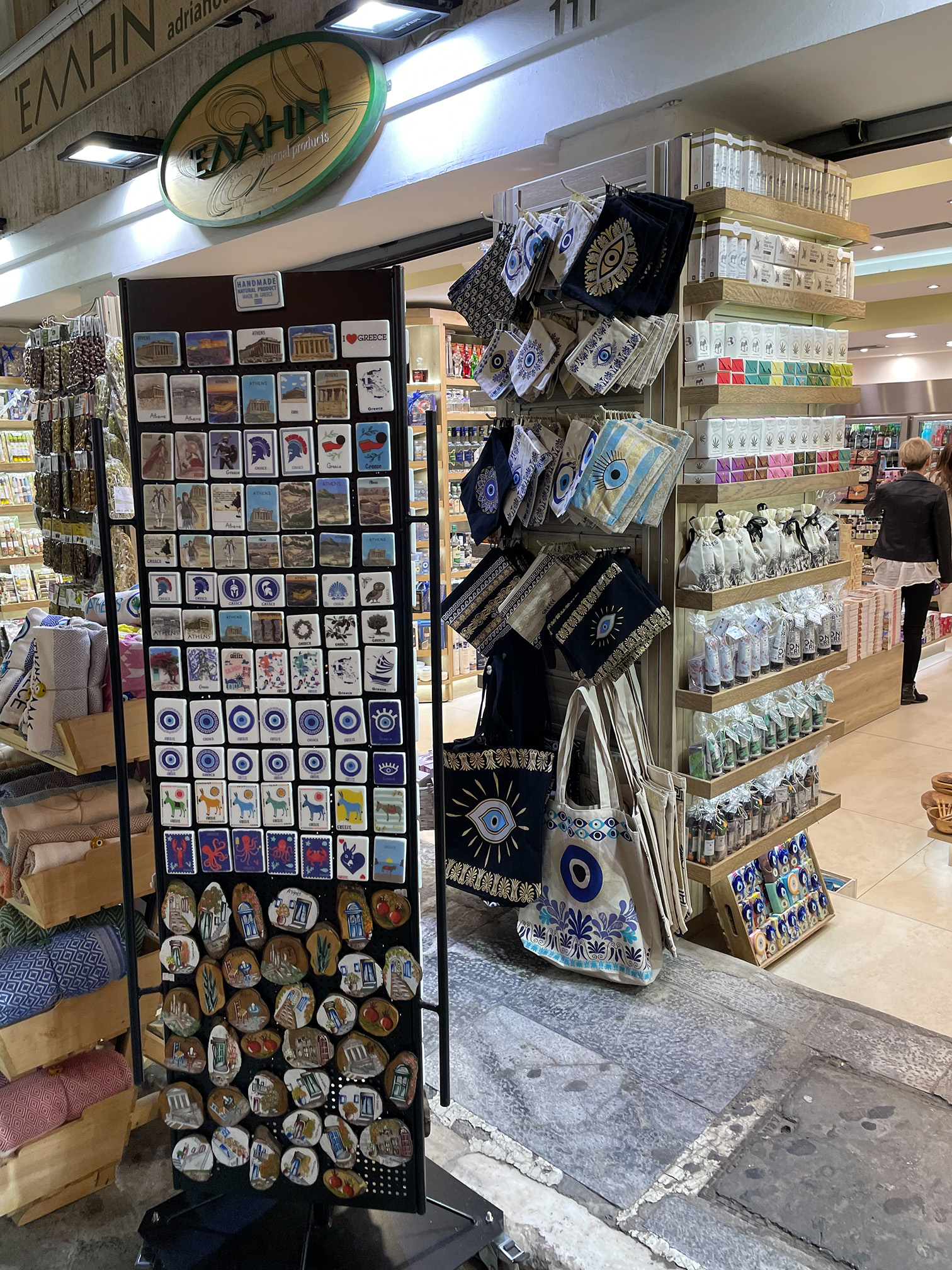Pamiątki jak wszędzie kuszą turystów tak i w Atenach sklepów z pamiątkami jest cała masa. Magnesy, oliwy, mydła i ozdoby w kolorach bieli i niebieskiego są urozmaiceniem ateńskiej ulicy. Nigdy nie mogę oprzeć się tym sklepikom bo są urocze i co najważniejsze często oferują unikalne i typowe tylko dla danego miejsca produkty wytworzone często manualnie przez lokalnych producentów. Niesie to ze sobą wartość również sentymentalną a pamiątki tego typu zawsze są radością głównie po czasie, gdy chcemy pamięcią wrócić do odwiedzanych miejsc.