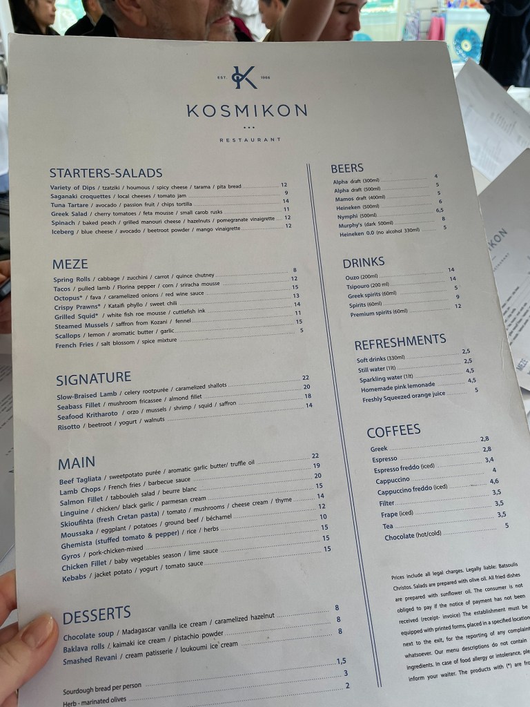 2. Kosmikon – Kosmikon to rodzinna grecka restauracja założona w 1966 roku, położona w pięknej i malowniczej okolicy Plaki. Ugościł nas tu Grek mówiący po polsku, który jak się później okazało swą biegłość w polszczyźnie zawdzięcza zaślubinom z Polką. Jedzenie pycha – szczególnie owoce morza.