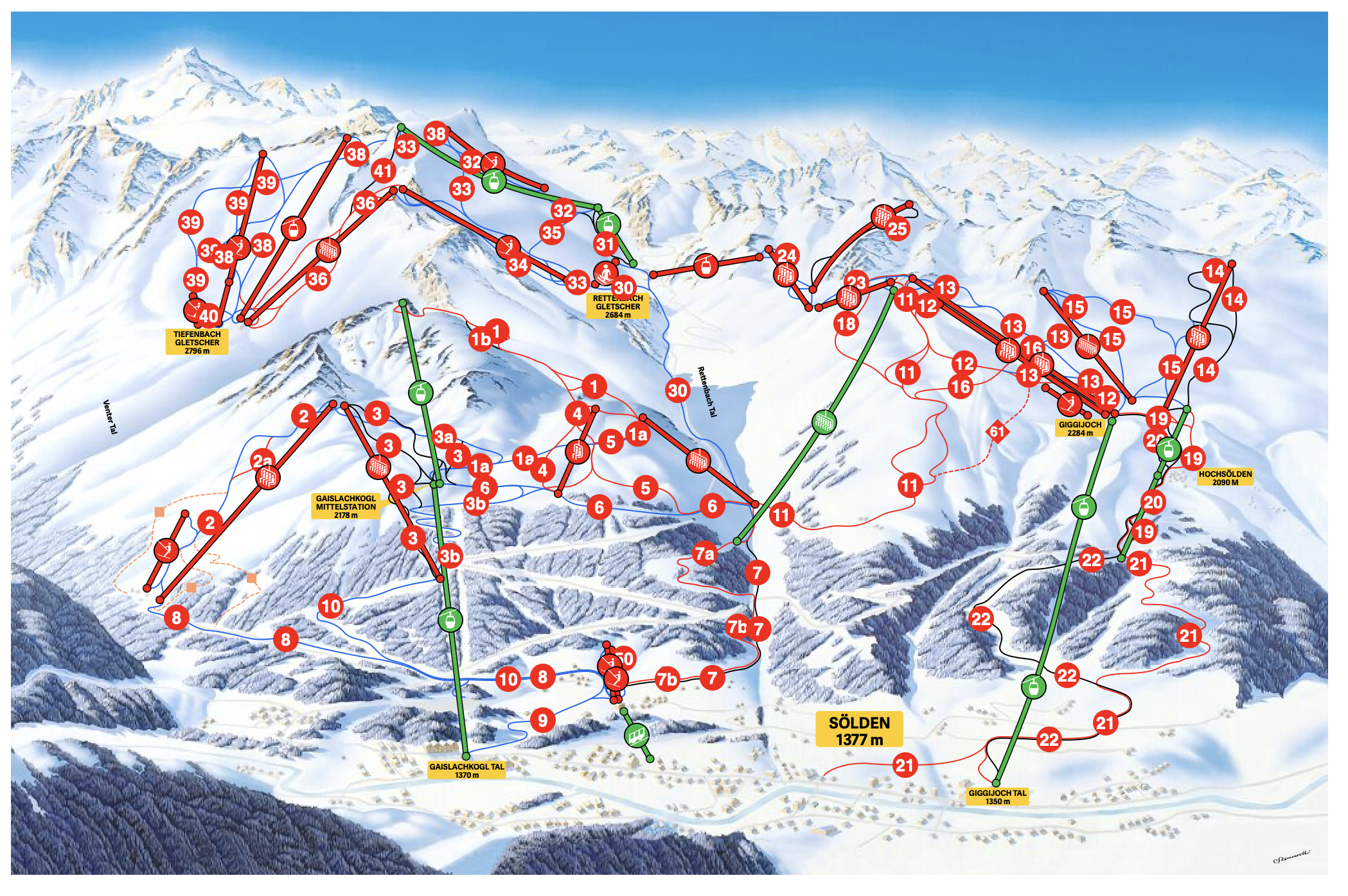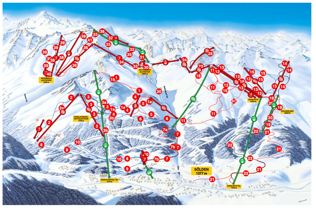 Sölden znane jest przede wszystkim z zawodów alpejskiego Pucharu Świata, 144 kilometrów tras narciarskich i wyciągów na lodowcach Tiefenbachgletscher i Rettenbachgletscher. Dla początkujących narciarzy przygotowano rejon przełęczy Giggijoch. Bardziej doświadczeni świetnie odnajdą się na Gaislachkogel. Natomiast wszystkich tych, którzy lubią szybką jazdę i fanów szerokich łuków z pewnością zachwycą świetne pasy startowe i szerokie pasma w środkowej części na lodowcach Tiefenbach i Rettenbach.